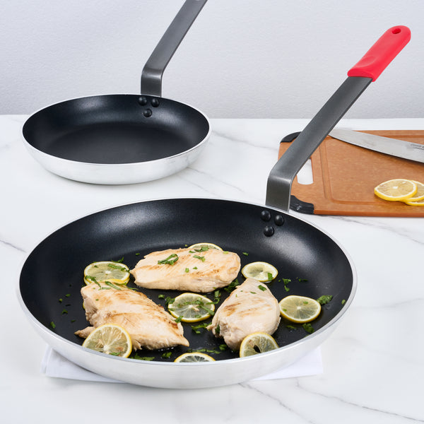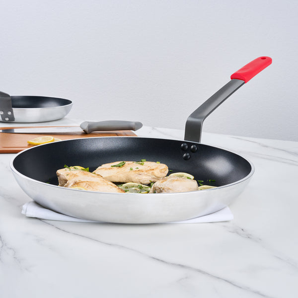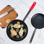 Elevate your kitchen efficiency and culinary excellence with our Bundle: Met Lux 1 Aluminum 14" Induction Ready Fry Pan with 1 Red Silicone Pan Handle Sleeve. This aluminum fry pan features a non-stick surface, ensuring that food effortlessly slides off and significantly reduces the need for excessive oil or butter. The stainless-steel bottom plate of this fry pan is compatible with induction cooktops, expanding your cooking possibilities. Made with heavy-duty aluminum, this skillet pan distributes heat evenly, preventing hot spots and ensuring perfectly cooked dishes every time. The triple-riveted handles of this saute pan provide a firm and secure grip, minimizing the risk of kitchen accidents. This induction fry pan is oven-safe and can be used on ceramic and electric cooktops, making it ideal for a variety of cooking methods. For easy maintenance, this induction frying pan is hand washable, allowing for quick and efficient cleanup. The handle of this induction-ready pan features a hanging hole, offering convenient storage and organization in your kitchen. This silicone sleeve is heat-resistant up to 450F, allowing you to handle hot pan with ease and safety. With a removable design, this pan handle sleeve lets you switch between pan effortlessly, saving you valuable time and effort in a busy kitchen. Designed with molded indentations, this removable handle sleeve ensures a stable and comfortable grip. This aluminum cooking pan measures 26.77 inches in length by 14.1 inches in width by 5.71 inches in height. Each order includes 1 pan and 1 sleeve.