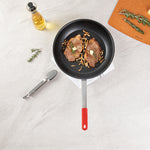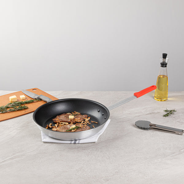 Enhance your kitchen's efficiency with our Bundle: Met Lux 1 Aluminum 14" Non-Stick Fry Pan with 1 Red Silicone Pan Handle Sleeve. This aluminum fry pan features a non-stick coating, ensuring an effortless cooking experience while preparing exquisite dishes. Made from 3 mm thick aluminum, this frying pan provides even heat distribution throughout the pan and provides consistently cooked dishes. Designed to be induction-ready, this skillet pan offers versatile cooking solutions. The triple-riveted handle on this aluminum skillets provides added durability and stability while handling hot pan. With a hanging hole, this aluminum pan allows you to hang them easily for convenient storage. This cooking pan is hand washable to maintain its non-stick coating and overall appearance. This pan handle sleeve withstands heat up to 450F, ensuring your hands stay cool and secure even during the busiest cooking times. With molded indentations, this removable handle sleeve provides a secure grip, reducing the chances of slips and spills. The removable design of this handle sleeve allows easy cleaning and storage, enhancing your kitchen's efficiency. This aluminum skillet pan measures 25.98 inches in length by 14.17 inches in width by 6.38 inches in height, providing ample space for cooking a wide variety of dishes. Each order includes 1 pan and 1 sleeve.