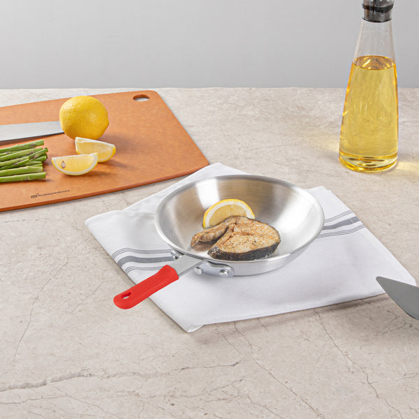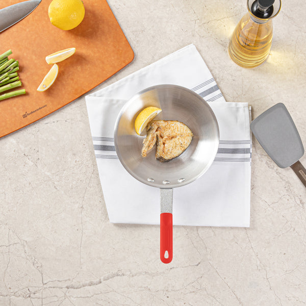 Elevate your kitchen's efficiency with our Bundle: Met Lux 1 Aluminum 7" Fry Pan with 1 Red Silicone Pan Handle Sleeve. Crafted from 3.5 mm thick aluminum, this fry pan ensures even heat distribution, offering consistent cooking results for your culinary creations. The lightweight design of this aluminum fry pan makes it effortless to flip, stir, and saute your dishes, enhancing your cooking precision. Featuring a satin finish, this frying pan is perfect for searing, sauteing, and browning food, adding a touch of finesse to your meals. The triple-riveted handle of this skillet pan provides a secure and comfortable grip, allowing for confident maneuvering while cooking. With a convenient hanging hole, this skillet simplifies storage and keeps your kitchen organized. Designed for hand washing, this aluminum skillets are easy to maintain and ensure long-lasting performance. The removable design of this silicone sleeve allows for easy interchange between pans, improving kitchen efficiency and reducing clutter. With the ability to withstand heat temperatures up to 450F, this removable handle sleeve protects your hands from burns, ensuring the safe handling of hot pan. Featuring molded indentations, this pan handle sleeve offers a secure grip, minimizing the risk of accidental slippage and enhancing safety. Measuring 12.99 inches in length by 7.56 inches in width by 2.28 inches in height, this aluminum cooking pan provides ample space for frying a variety of ingredients. Each order includes 1 pan and 1 sleeve.