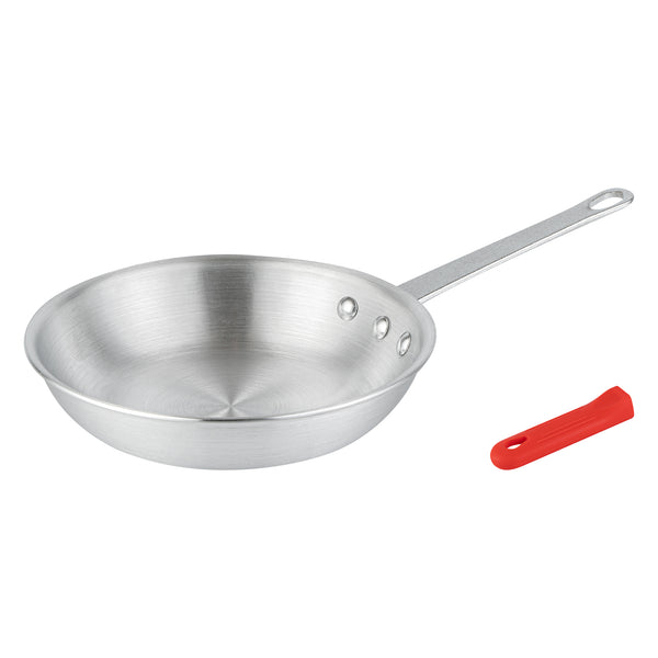 Flip pancakes with our Bundle: Met Lux 1 Aluminum 9" Fry Pan with 1 Red Silicone Pan Handle Sleeve. Crafted from 3.5 mm thick aluminum, this frying pan ensures even heat distribution, delivering perfectly cooked dishes every time. The lightweight design of this fry pan allows for easy flipping and maneuvering of your favorite meals, reducing fatigue during extended cooking sessions. Featuring a satin finish, this aluminum fry pan is perfect for searing and browning, bringing out the best flavors in your ingredients. Built with a sturdy, triple-riveted handle, this skillet pan offers a secure grip, making cooking and transporting hot pan safer. Integrated hanging holes on the skillet pan provide convenient storage and quick access, saving valuable kitchen space. This aluminum skillet is best maintained through hand washing, ensuring optimal care and longevity. With a heat resistance of up to 450F, this silicone sleeve protects your hands from burns, ensuring secure handling of hot pans. The molded indentations on this pan handle sleeve offer a firm grip, minimizing accidental slippage while cooking. This removable handle sleeve allows you to switch between cookware effortlessly. Measuring 14.57 inches in length by 8.66 inches in width by 2.95 inches in height, this aluminum saute pan provides ample room for cooking a variety of dishes. Each order includes 1 pan and 1 sleeve.