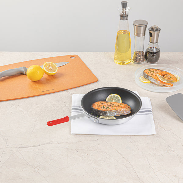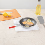 Enhance your culinary efficiency with our Bundle: Met Lux 1 Aluminum 9" Non-Stick Fry Pan with 1 Red Silicone Pan Handle Sleeve. This non-stick fry pan ensures food slides right off, making both cooking and cleanup effortless. Crafted from 3 mm thick aluminum, this frying pan offers even heat distribution and long-lasting durability, ideal for consistent cooking results. Conveniently induction-safe, this skillet pan is versatile and compatible with various stovetops, enhancing your cooking options. The triple-riveted handle of this aluminum fry pan provides a secure and comfortable grip. This cooking pan is equipped with hanging holes to facilitate easy storage, keeping your kitchen organized. To maintain its premium non-stick coating, this kitchen pan should be hand washed and designed for longevity and repeated use. This pan handle sleeve withstands heat temperatures up to 450F, protecting hands from burns and ensuring safe handling of hot pan. Featuring molded indentations, this removable handle sleeve provides a secure grip, minimizing accidental slippage during use. The removable design of this red silicone sleeve allows for easy interchangeability between different pan. This aluminum pan measures 14.57 inches in length by 8.66 inches in width by 2.95 inches in height, offering ample space for all your cooking needs. Each order includes 1 pan and 1 sleeve.