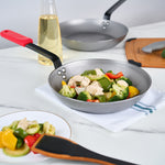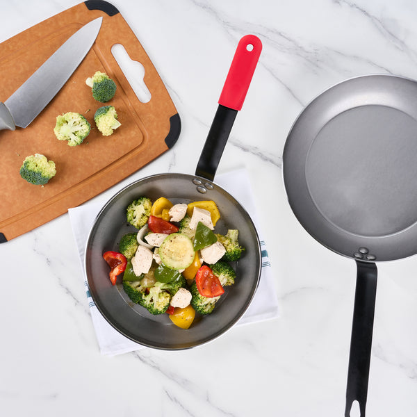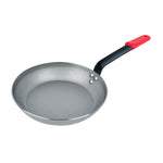 Revolutionize your kitchen operation with our Met Lux Carbon Steel 10" Non-Stick Fry Pan with a Red Silicone Pan Handle Sleeve. This fry pan, constructed from 3 mm thick carbon steel, ensures superior durability and optimal heat distribution for uniform cooking. The lightweight design of the fry pan simplifies the cooking process, making it a must-have in any high-traffic kitchen. After seasoning, this hand-washable skillet pan develops non-stick properties, greatly enhancing your culinary experience. With this carbon steel pans oven-safe capability, you can transition dishes seamlessly from the stovetop to the oven. The triple-riveted handle of the fry pan ensures a secure grip, providing confidence during cooking and pan transfer. This induction-safe fry pan is compatible with all types of stovetops, offering a versatile frying solution. The hanging hole on the handle of the fry pan allows for convenient storage, saving precious kitchen space. The black silicone removable pan handle sleeve is heat-resistant up to 450F, protecting your hand from burns. The molded indentation on the handle sleeve ensures a firm grip even in high-heat situations, and its removable design allows for flexible use on multiple pans. For added convenience, this handle sleeve features a hanging loop for easy storage and is dishwasher safe for effortless maintenance. Measuring 18.31 inches in length by 10.24 inches in width by 4.06 inches in height, this 10-inch pan offers ample space for various dishes. The order includes 1 pan and 1 sleeve.