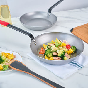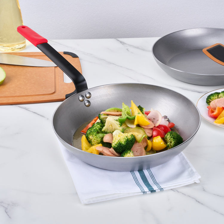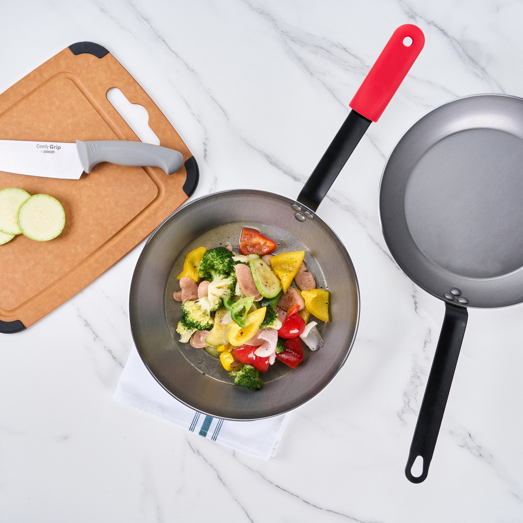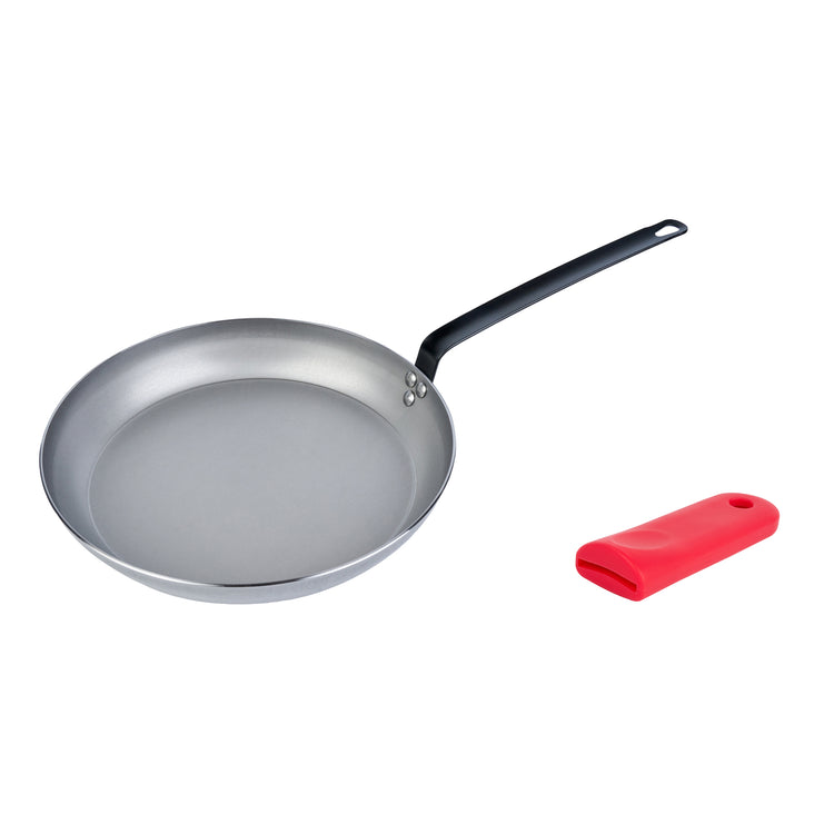 Upgrade your kitchen arsenal with our Met Lux 6 Carbon Steel 12" Non-Stick Fry Pan with a Red Silicone Pan Handle Sleeve. Engineered with 3 mm thick carbon steel, this premium fry pan is lightweight, ensuring easy handling while offering superior heat distribution for consistent cooking results. This skillet pan achieves non-stick properties once seasoned, allowing you to prepare delicious meals without food sticking. Oven-safe and induction-safe, this versatile steel fry pan can be used on various heat sources, accommodating diverse cooking needs. Featuring a triple-riveted handle with a hanging hole, this frying pan provides a secure grip and convenient storage options. Hand wash this fry pan to maintain its pristine condition over time. Paired with the fry pan is this red silicone sleeve that offers heat resistance of up to 450F, ensuring a comfortable grip on hot pans. The removable design of this handle sleeve enables quick and easy switching between pans, saving time and effort in a busy kitchen. Plus, the molded indentations on this silicone sleeve provide a secure and comfortable grip, while the hanging loop allows for easy storage and organization. The dishwashable design of this handle sleeve ensures hassle-free cleaning after use. The 12-inch carbon steel fry pan measures 21.34 inches in length by 11.81 inches in width by 4.72 inches in height, providing ample space for cooking a variety of dishes. Each order includes 1 pan and 1 sleeve.