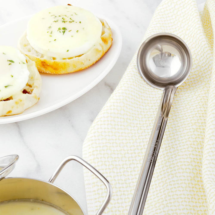 Serve sauces or glazes with our Met Lux 1-Ounce Stainless Steel Serving Ladle. This serving spoon is crafted from stainless steel and is suitable for long-lasting use as it won't corrode or rust easily. Engraved with a capacity marker, this stainless steel spoon contains up to 1 ounce and is the ideal tool for precise and elegant serving, ensuring your dishes are beautifully presented with just the right amount of garnish or sauce. The long handle of this serving ladle has a slight curved at the end offers a more comfortable grip and better control when scooping and pouring liquids, such as soups, stews, or sauces. This sauce spoon is dishwasher-safe to simplify your cleaning process after meals. Measuring 11.5 inches long by 2.25 inches wide by 1 inch tall, this soup spoon can hold up to 1 ounce. Sold in a 1 count box.