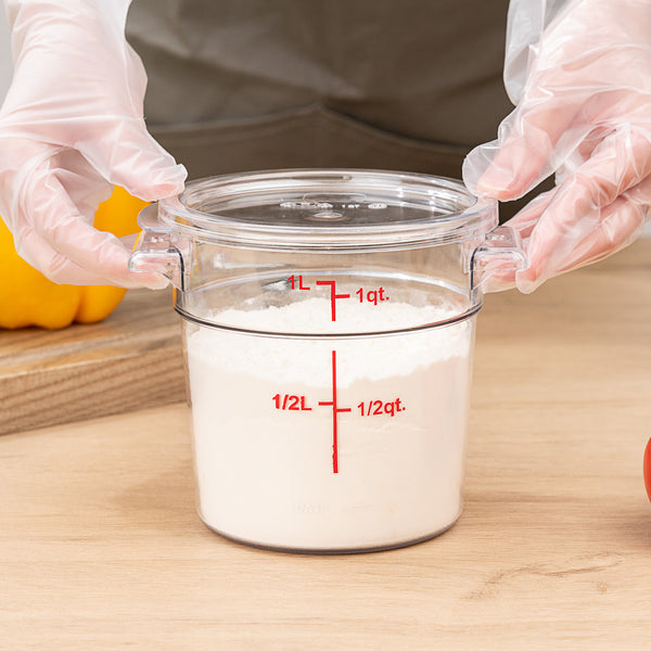 Easily keep track of your inventory with our Met Lux 1-quart Round Clear Plastic Food Storage Container. With red quart and liter graduations, this commercial food storage container allows you to practice proper inventory management. Designed with a clear finish, this food container displays your ingredients for quick identification. The handles of this food prep container provide a comfortable grip while transporting vegetables to your storage room. Crafted from high-quality plastic, this professional food container endures temperatures from -40F to 210F. Great for storing sliced peppers or tomato paste, this freezer-safe container is stain and odor-resistant to maintain their premium appearance. This plastic food container is dishwasher-safe to shorten cleanup during and after shifts. Featuring a round shape, this clear food container is stackable to save space in your storage area. Combine this round food container with our compatible lid to prevent leaks and spills. This 1-quart graduated food container measures 5 inches in diameter and 4.75 inches in height. Sold in a 1 count box. Food storage lid (SKU: RWT0845-1) is available and sold separately.