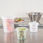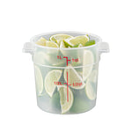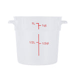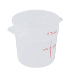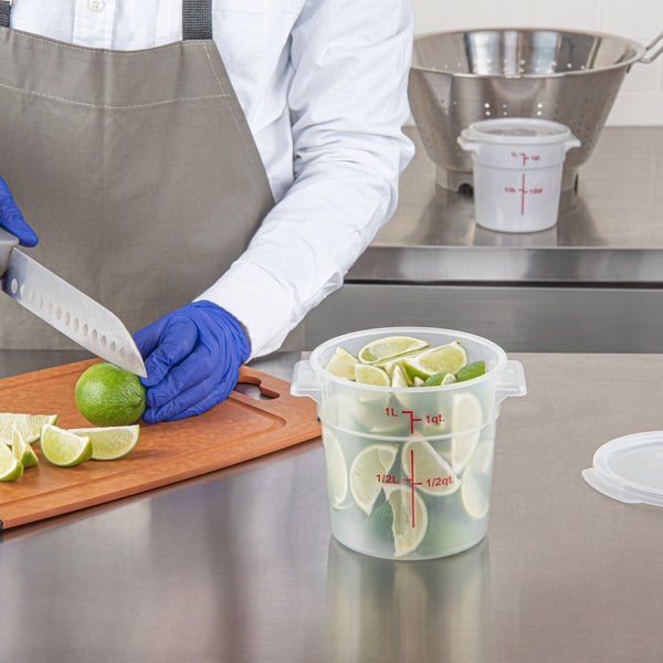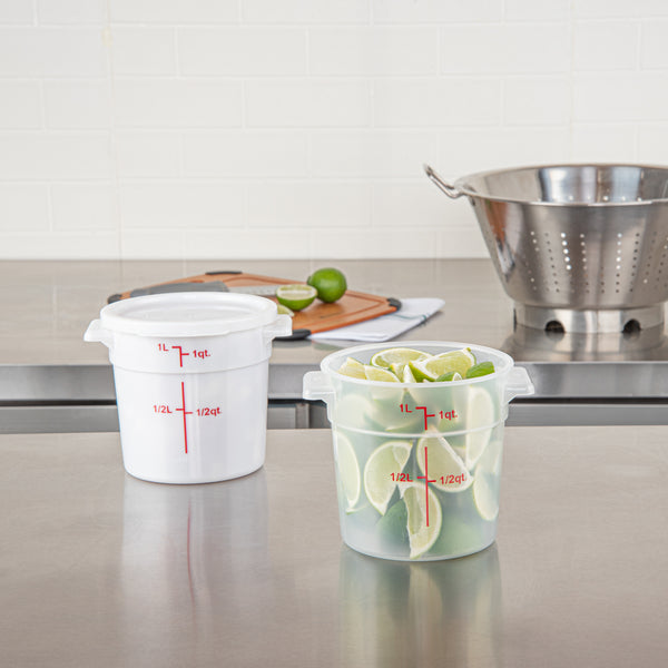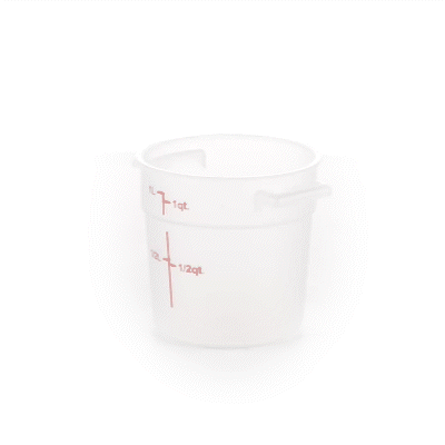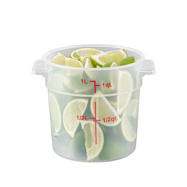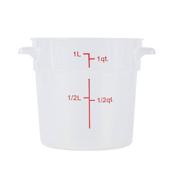 Our Met Lux 1-quart Round Translucent Plastic Food Storage Container is a versatile and efficient solution for all your food storage needs. Crafted from durable pp plastic, this food storage container is designed to withstand daily use in a busy kitchen environment. With red volume graduations, this round plastic food container makes it easy to measure out precise portions, reducing waste and saving on food costs. The sturdy handle of this storage container enhances the stability and ease of transport, ensuring a secure grip even when the container is full. This translucent food container is dishwashable and freezable, providing you with more options for food preparation and storage. Designed to withstand temperatures from -40F to 160F, this round plastic container is perfect for storing a variety of foods, from chilled salads to hot soups. With a capacity of 1 quart and measuring 5 inches in diameter by 5 inches in height, this plastic food container possesses plenty of room for storing your delicious creations. Pair this storage container with our compatible lid (SKU: RWT1569C-1) to provide a tight seal, keeping your food fresh and protected. Sold in a 1 count box. Lids are available and sold separately.