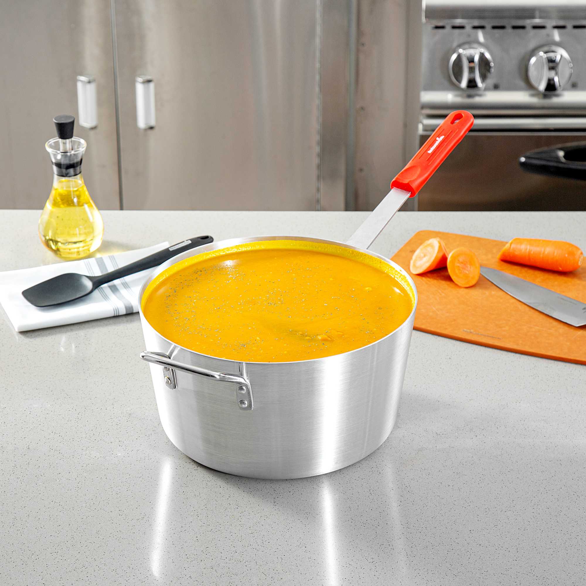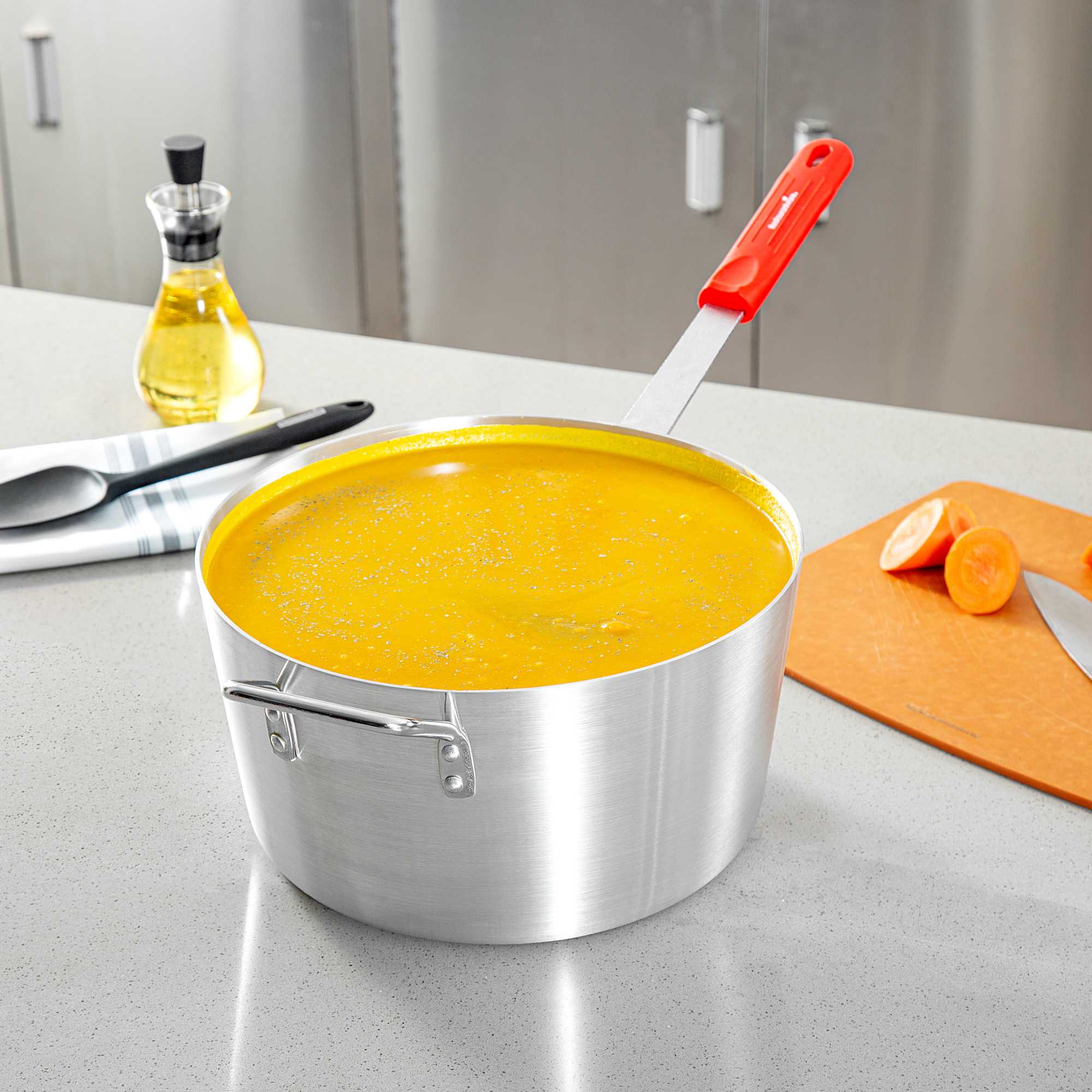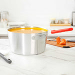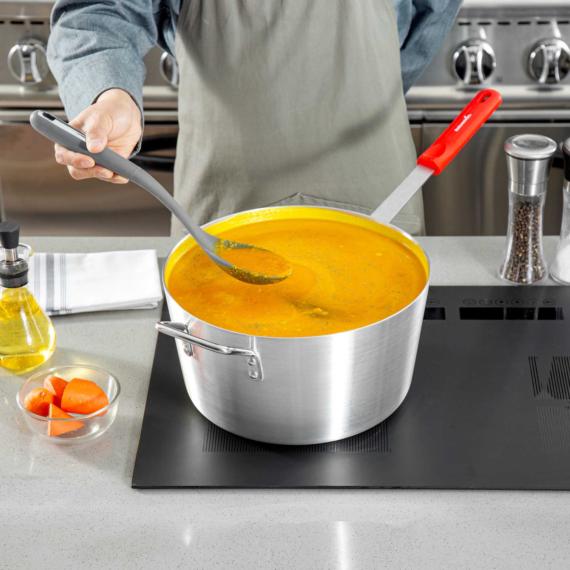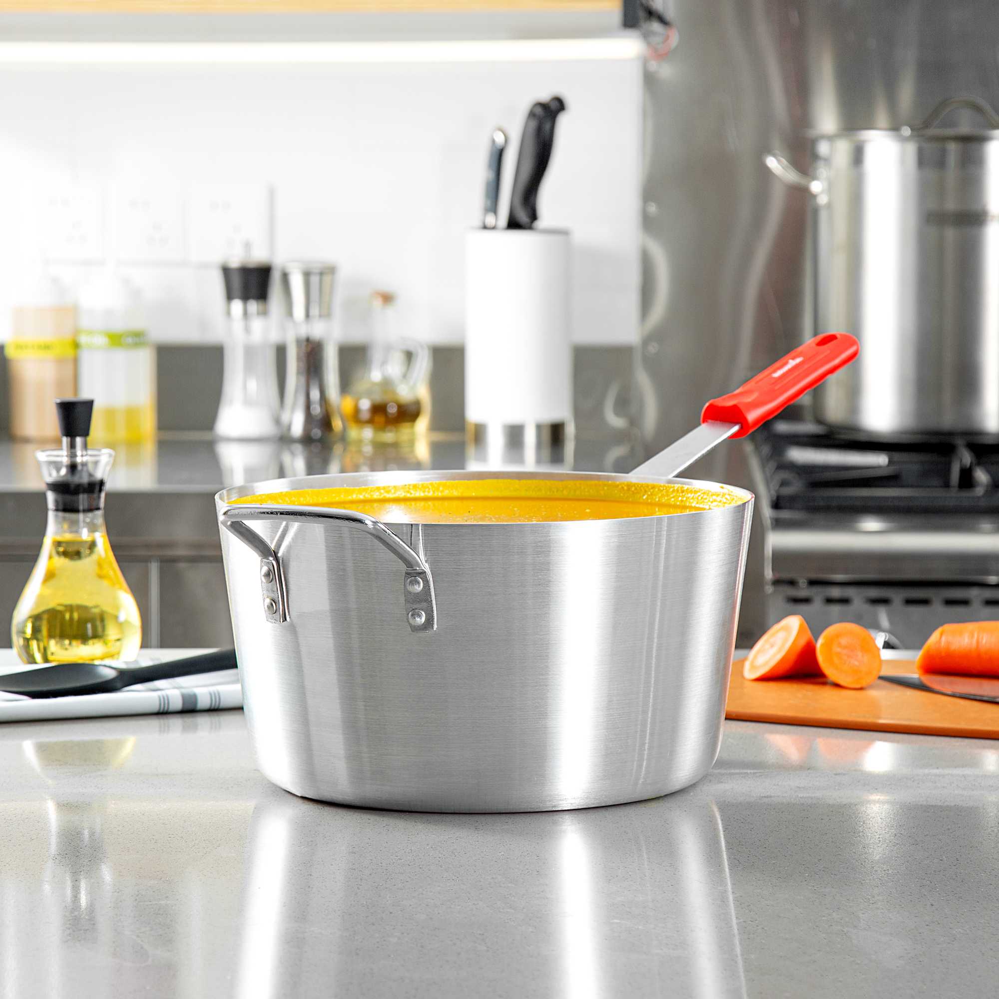 Achieve precise culinary results with this versatile 10 qt sauce pan. The Met Lux Heat Distribution Sauce Pan is expertly crafted with a tapered aluminum design, promoting efficient stirring and cooking at lower temperatures, ideal for busy kitchens. Constructed from 2.5-millimeter thick 3003 series aluminum, this 10 quart aluminum cooking pot ensures excellent heat distribution and resists warping, making it a reliable choice for both home cooks and commercial chefs. This commercial sauce pan features a red silicone handle that remains cool up to 450F, providing a secure, comfortable grip that minimizes burn risks. Compatible with standard lids (sold separately), this pan offers versatile cooking applications, seamlessly integrating into any cookware collection. With a sleek silver finish and dimensions of 24.41 inches in length, this sauce pan combines practicality with a professional look. Sold in a 6 count box.