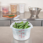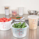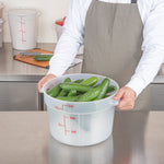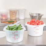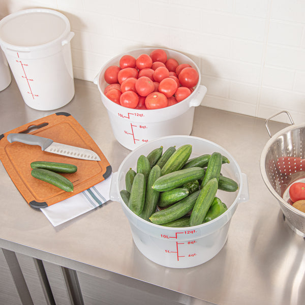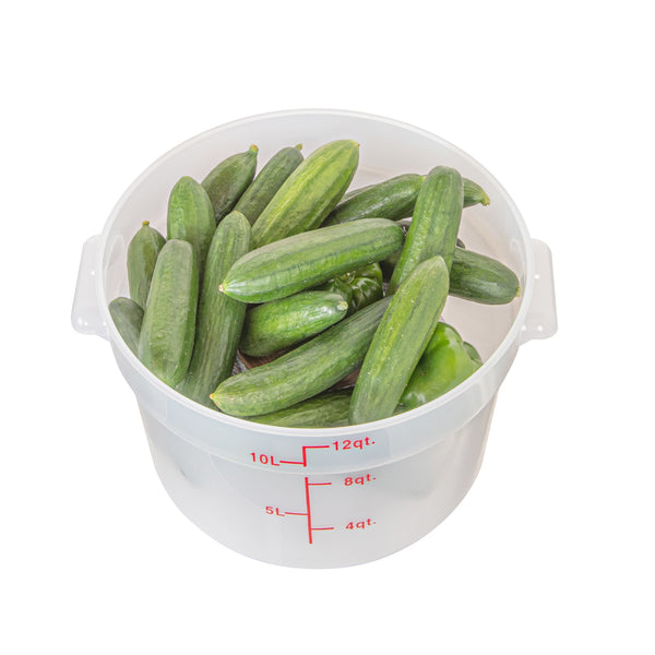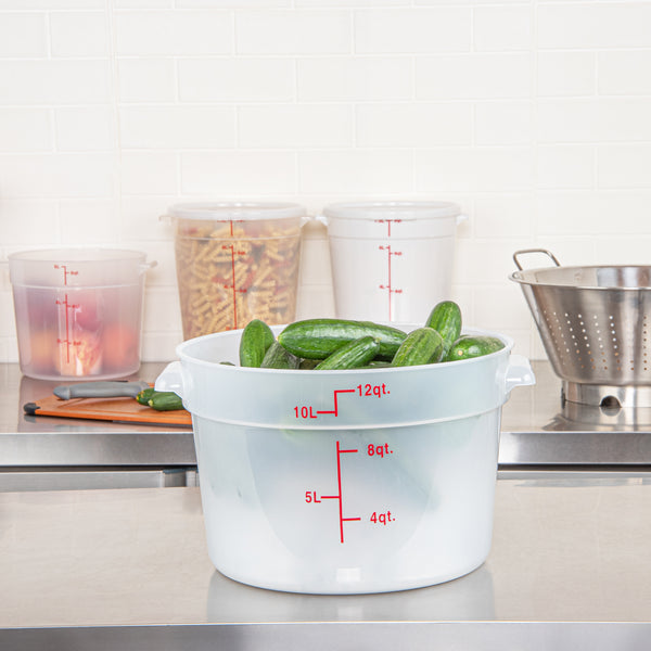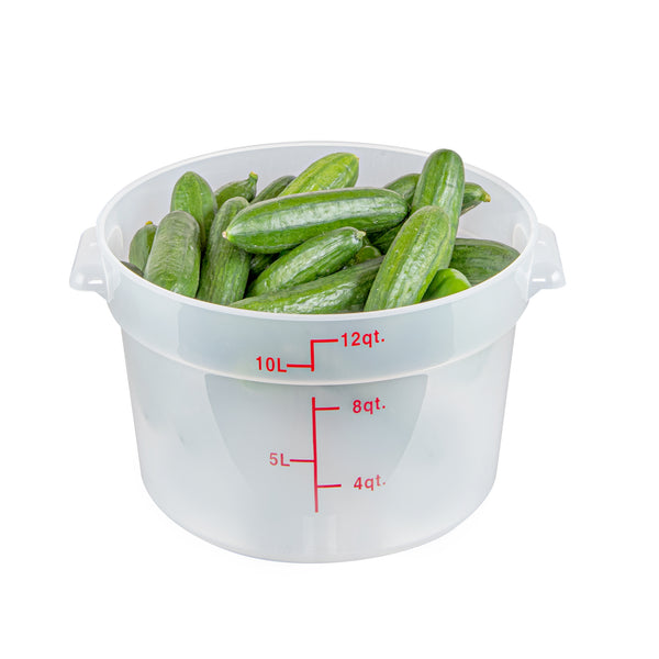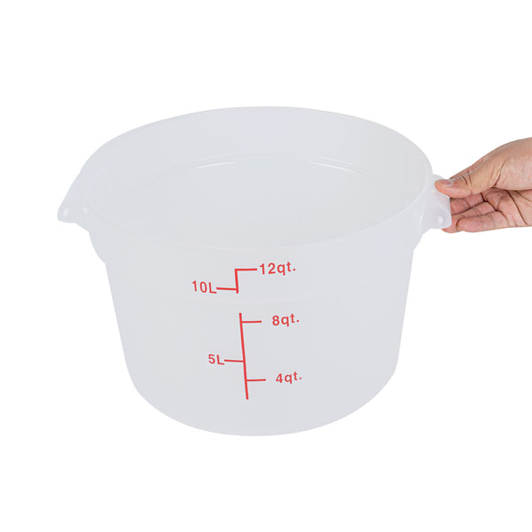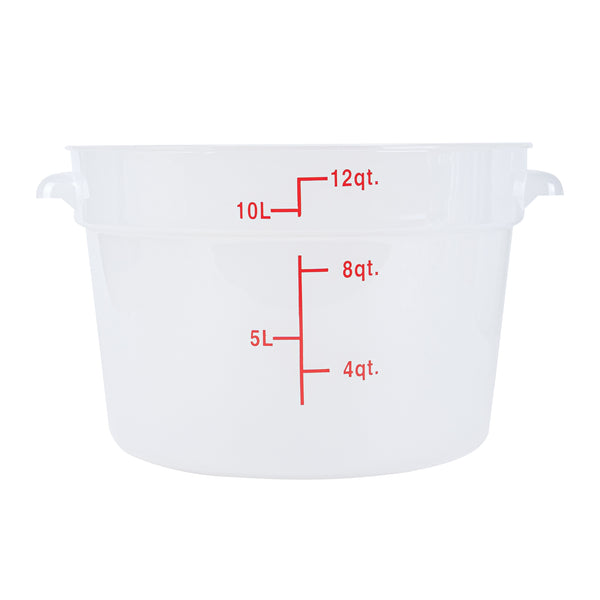 Provide the perfect solution for your kitchen with our Met Lux 12-quart Round Translucent Plastic Food Storage Container. With its durable PP plastic construction, this food storage container ensures long-lasting use and withstands the daily rigors of a busy kitchen. Crafted to withstand temperatures ranging from -40 to 160 degrees Fahrenheit, this round plastic food container is ideal for storing hot soups or freezing cold desserts. The integrated handle provides a stable grip for secure transport, enhancing the functionality of this food container. Featuring red volume markers, this storage container makes it easy to measure ingredients and keep track of inventory, ensuring efficiency in your foodservice establishment. The translucent design of this round plastic container facilitates easy content identification, reducing time wasted on unnecessary lid removals. With a generous capacity of 12 quarts, this round plastic food container is perfect for storage, providing valuable kitchen space. Measuring 12.25 inches in diameter by 8 inches in height, this food container is compact enough for easy storage but spacious enough to hold large quantities of food. Pair this container with a compatible lid (SKU: RWT1579C-1) for a complete storage solution. Sold in a 1 count box. Lid is available and sold separately.