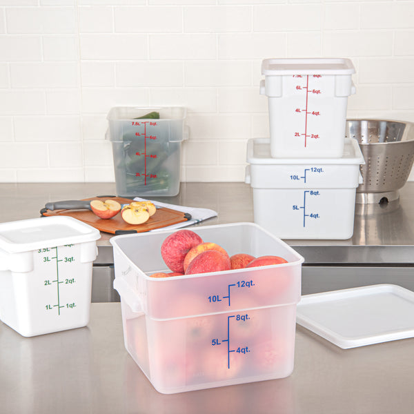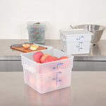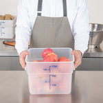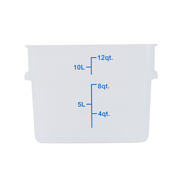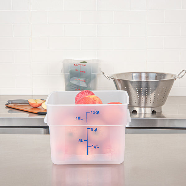 Maximize kitchen efficiency with precise portion control. The Met Lux Graduated Plastic Storage Container's blue graduations enable precise portioning, reducing waste in your food storage practices with this reliable plastic storage container. Crafted from durable PP plastic, this translucent container withstands demanding kitchen settings, ensuring longevity and resilience. Its stable handles allow for effortless transport, minimizing spillage. With its stackable design, this clear plastic container optimizes space in your storage areas. Measuring 10.88 inches in length, 10.88 inches in width, and 8 inches in height, this stackable storage box fits seamlessly into your workflow while accommodating up to 12 quarts of ingredients. Dishwasher safe and suitable for both hot and cold foods, it is a versatile addition to any kitchen. Elevate your storage solutions today with this indispensable stackable storage box. Each order includes 1 Met Lux Graduated Plastic Storage Container.