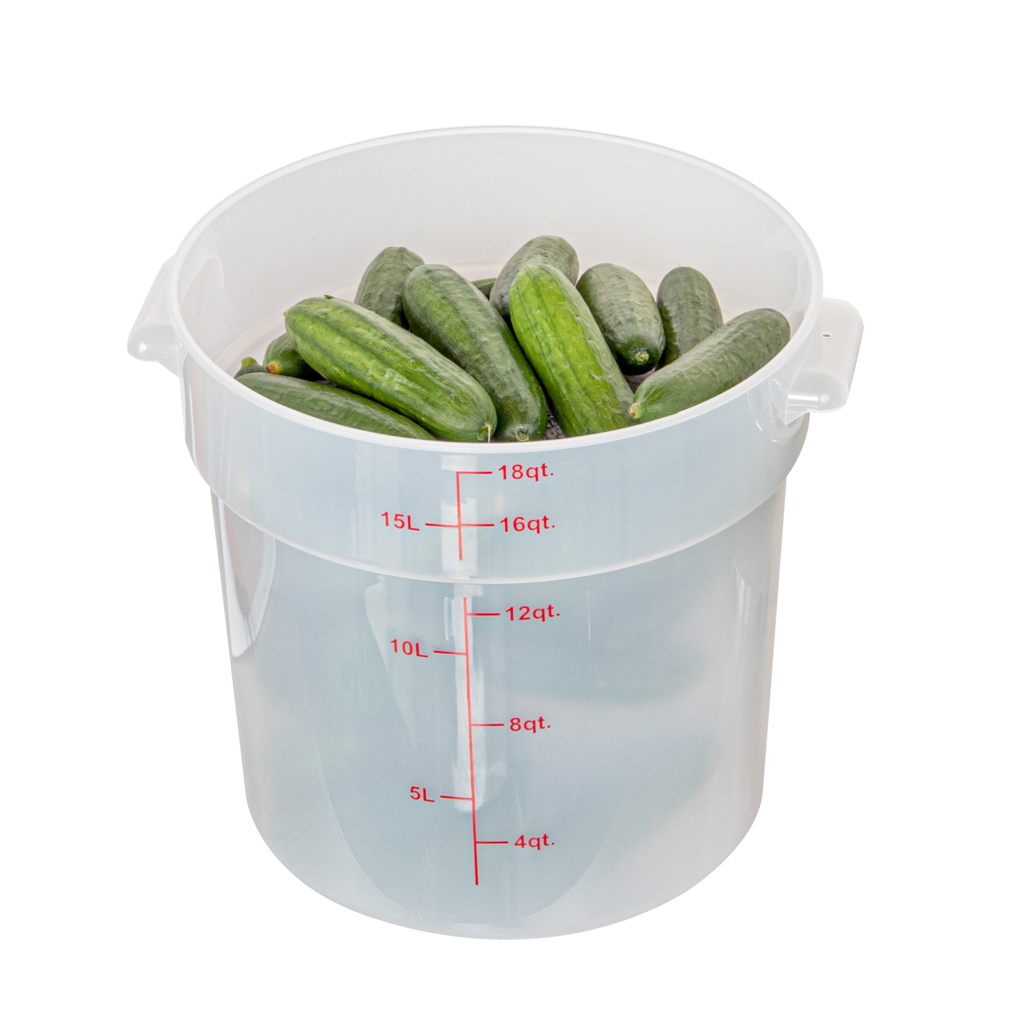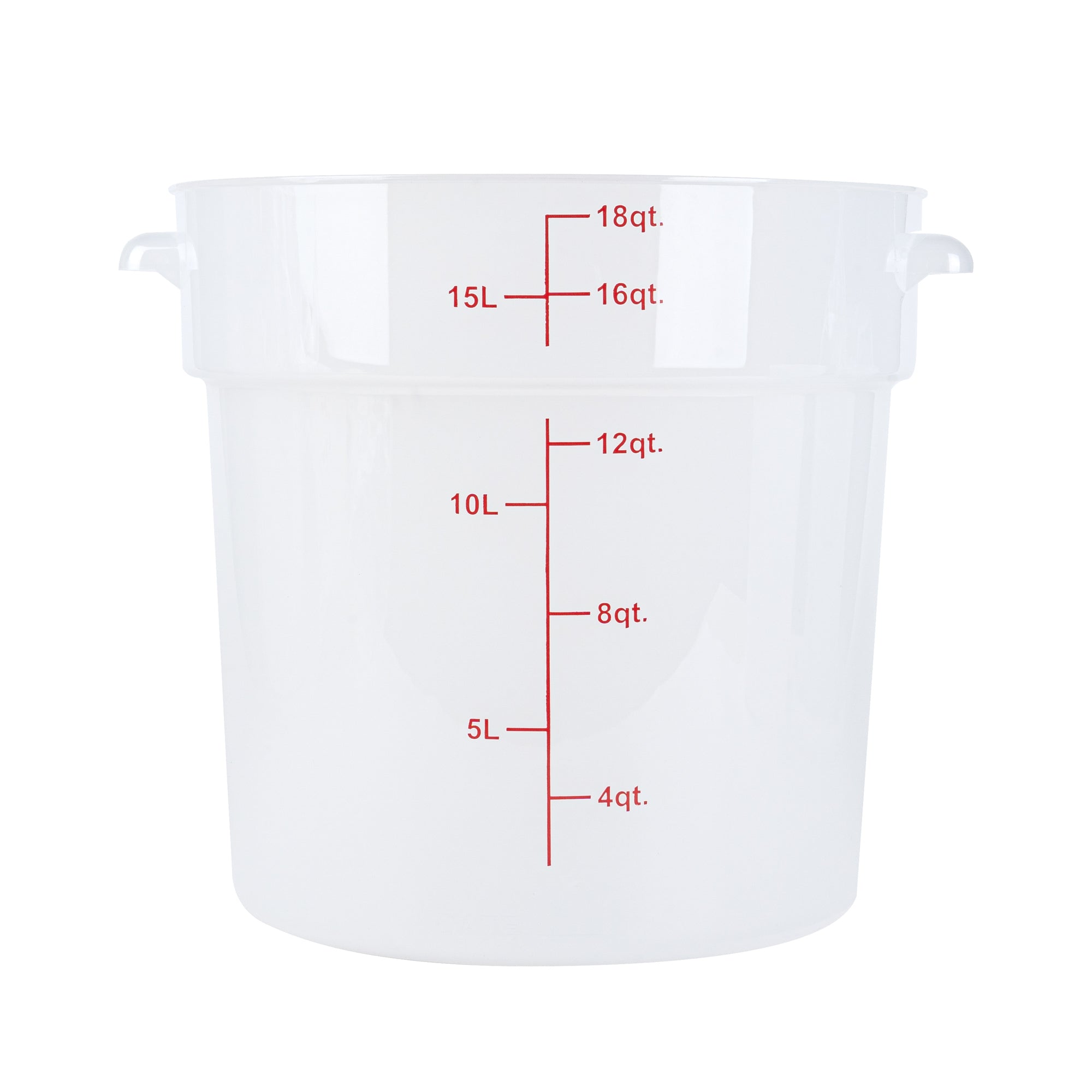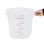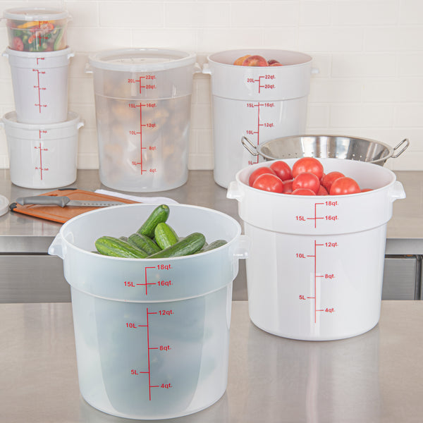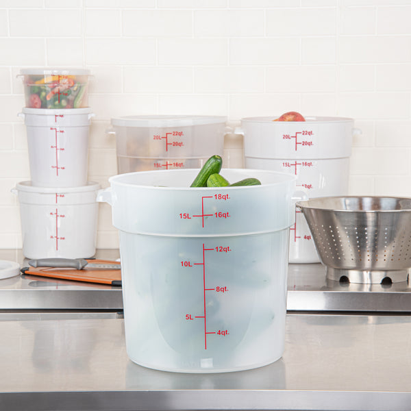 Streamline your food storage process with our Met Lux 18-quart Round Translucent Plastic Food Storage Containers. These food storage containers are crafted from durable PP plastic, ensuring longevity and reliability in any kitchen setting. With red volume markers and graduations, these plastic food storage containers make portioning a breeze, saving you time and reducing waste. These food containers feature stable containers, providing superior grip and control, allowing for easy transport and minimizing accidents. Designed for versatility, these round plastic food containers can be easily cleaned in the dishwasher and can be used for storing leftovers in the freezer. Plus, these plastic food storage containers can withstand temperatures ranging from -40 to 160 degrees Fahrenheit, making them perfect for a wide range of food items. Pair these storage containers with our available lids (SKU: RWT1579C) to create a secure seal, preserving the freshness and quality of your culinary creations. These translucent food containers, with a generous capacity of 18 quarts and measuring 12.25 inches in diameter by 12 inches in height, offer ample space for storing a variety of food items while allowing for quick identification. Sold in a 10 count box. Lids are available and sold separately.