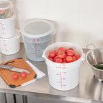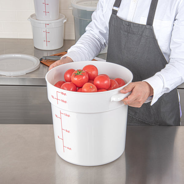 Upgrade your food storage solutions with our Met Lux 18-quart Round White Plastic Food Storage Container. The durable PP plastic construction ensures this food container withstands daily use in busy commercial kitchens while maintaining its shape. Featuring red volume markers, this round plastic food container allows for easy measurement of ingredients and portion control. Conveniently equipped with a stable handle, this storage container provides a secure grip for effortless transport. Designed to withstand temperatures ranging from -40 to 160 degrees Fahrenheit, this white food container is suitable for use in the freezer and dishwasher, streamlining your food handling process. Pair this round plastic container with a matching lid (SKU: RWT1579C-1) to create a tight seal, keeping contents fresh and protected. With a generous 18-quart capacity and measuring 12.25 inches in diameter by 12 inches in height, this food storage container offers ample space for storing a variety of ingredients and prepared meals. Sold in a 1 count box. Lid is available and sold separately.