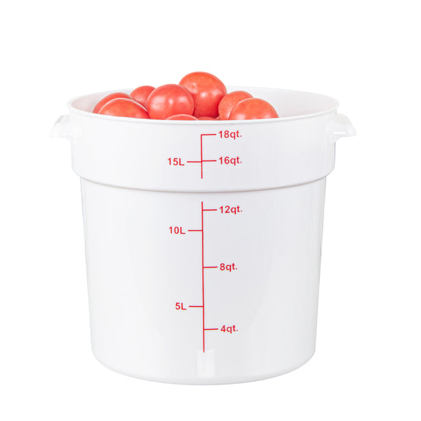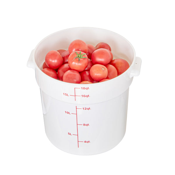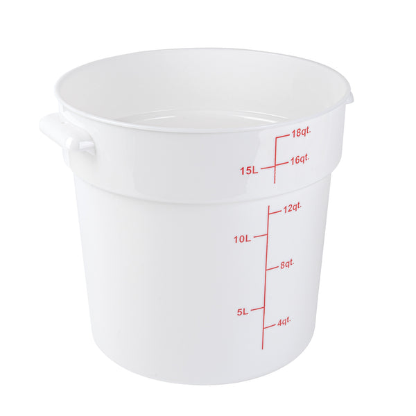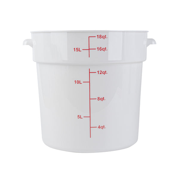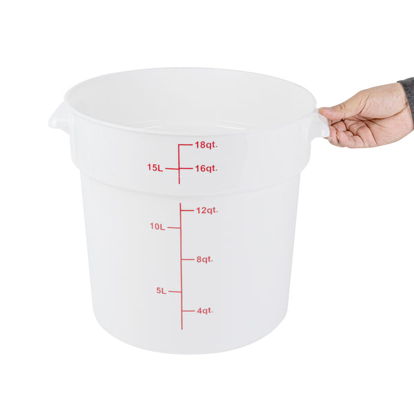 Upgrade your food storage solutions with our Met Lux 18-quart Round White Plastic Food Storage Containers. The durable PP plastic construction ensures these food containers withstand daily use in busy commercial kitchens while maintaining their shape. Featuring red volume markers, these round plastic food containers allow for easy measurement of ingredients and portion control. Conveniently equipped with stable handles, these storage containers provide a secure grip for effortless transport. Designed to withstand temperatures ranging from -40 to 160 degrees Fahrenheit, these white food containers are suitable for use in the freezer and dishwasher, streamlining your food handling process. Pair these round plastic containers with matching lids SKU: RWT1579C) to create a tight seal, keeping contents fresh and protected. With a generous 18-quart capacity and measuring 12.25 inches in diameter by 12 inches in height, these food storage containers offer ample space for storing a variety of ingredients and prepared meals. Sold in a 10 count box. Lids are available and sold separately.