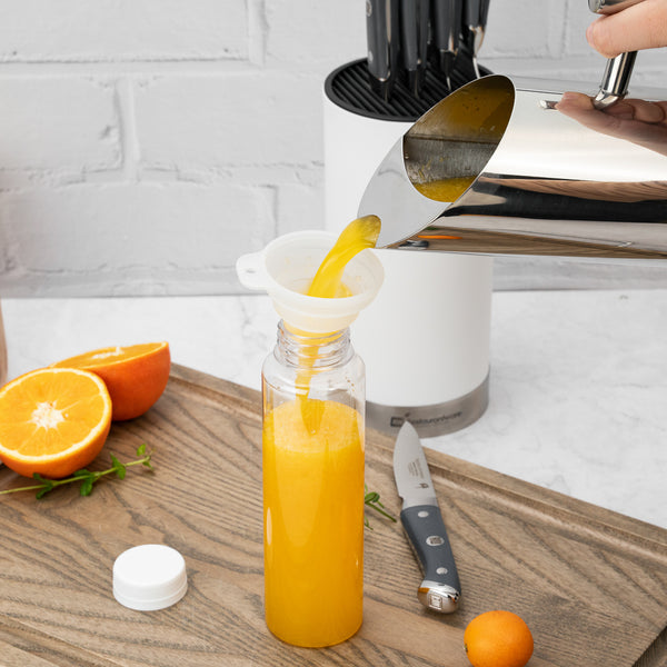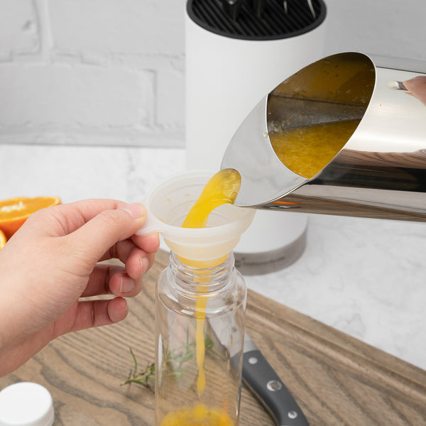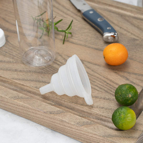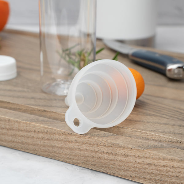 Expertly funnel liquids into jars or bottles using our Met Lux 2-ounce Silicone Funnel. A great addition to your bar or kitchen supplies, these silicone funnels feature ridges that are designed to collapse and fold down flat for easy storage after use. Made from high-quality silicone, these collapsible funnels are food-safe. To easily pour warm jellies or mixtures, these foldable funnels are conveniently heat-resistant. The narrow mouth of these silicone funnels is perfect for neatly transferring liquids or ingredients into all kinds of bottles. Designed with a small hanging hole, these collapsible funnels can be conveniently stored on hooks or inside drawers. Perfect for a hassle-free cleanup, these foldable funnels are dishwasher-safe. These silicone funnels hold up to 2 ounces and measure 2.7 inches in diameter by 2.5 inches in height when expanded. Sold in a 5 count box.