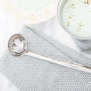 Serve gravies with our Met Lux 2-Ounce Stainless Steel Serving Ladle. Crafted from premium stainless steel, this serving spoon boasts a durable construction suitable for heavy-duty use as it won't corrode or rust. This stainless steel spoon is engraved with a capacity marker that it can hold 2 ounces, perfect for serving consistent portions. The long handle of this soup spoon has a curved end to provide a comfortable grip to facilitate a controlled pouring of liquids. Dishwasher-safe, this sauce spoon simplifies your cleanup routine. This serving ladle measures 11.75 inches long by 2.75 inches wide by 1 inch tall and can hold up to 2 ounces. Sold in a 1 count box.