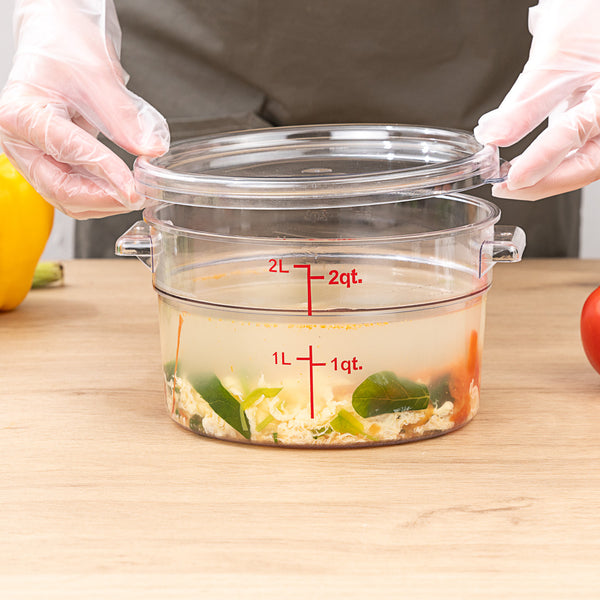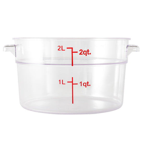 Easily store ingredients using our Met Lux 2-quart Round Clear Plastic Food Storage Container. This food storage container features red volume markers printed on each container that expertly measures up to 2 quarts. Crafted with premium plastic, this plastic food container is crack-resistant and scratch-resistant to withstand regular use in your commercial kitchen. Pair this food storage container with our matching lid for an airtight seal (SKU: RWT0853-1). This clear plastic food container includes built-in handles that provide a comfortable grip when transporting sauces or prepped meals around your establishment. Great for storing ingredients in commercial kitchens, this plastic food container is stain-resistant and odor-resistant. This food storage container can endure temperatures from -40F to 210F and is conveniently freezer-safe. This clear food container provides clear visibility of your foods and has a wide base to store large amounts of produce. For a quick clean up after use, this food storage container is dishwasher-safe. Measuring 7 inches in diameter by 4.25 inches in height, this 2-quart food container is shipped in a 10 count box. Food storage lid is available and sold separately.