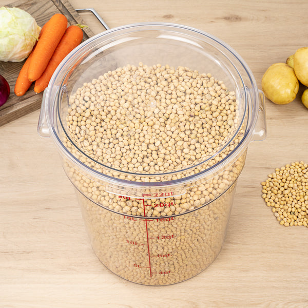 Accurately measure and store prepped foods using our Met Lux 22-quart Round Clear Plastic Food Storage Container. Designed to measure up to 22 liters or 22 quarts, this large food storage container features red volume markers printed on the side of each container. Perfect for foodservice establishments, coordinate this plastic container with our compatible lids (SKU: RWT0855-1) to keep hot or cold foods tightly sealed. This large food storage container withstands temperatures between -40F to 210F. This round clear container features 2 built-in handles that provide a stable grip to allow employees to safely transport produce throughout your kitchen. Ideal for storing hot or cold ingredients, this large food storage container is freezer-safe. Made from high-quality plastic, this plastic soup container is odor-resistant and stain-resistant to maintain the classic look of this container. To streamline clean up, this large food storage container is dishwasher-safe. This 22-quart container measures 12.25 inches in diameter by 15 inches in length. Sold in a 1 count box. Lid is available and sold separately.