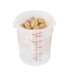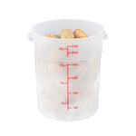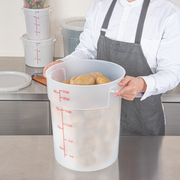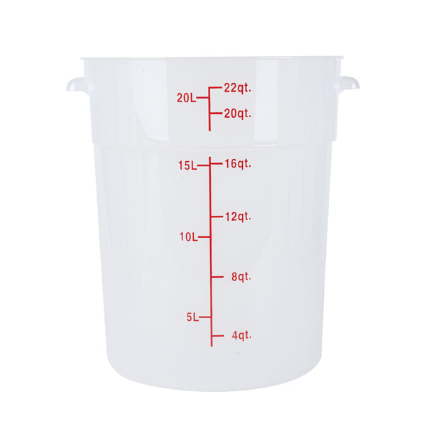 Upgrade your kitchen storage solutions with our Met Lux 22-quart Round Translucent Plastic Food Storage Containers. These food storage containers are crafted from durable PP plastic, ensuring long-lasting use in any professional kitchen. Featuring red volume markers, these plastic food storage containers make it easy to measure and portion ingredients accurately. With stable handles, these round plastic food containers provide a secure grip for easy transportation. Designed to be dishwashable and freezable, these storage containers can withstand temperatures ranging from -40 to 160 degrees Fahrenheit, making them versatile for a variety of food items. Pair these translucent food containers with compatible lids (SKU: RWT1579C) to keep your ingredients fresh and well-protected. Boasting a generous 22-quart capacity and measuring 12.25 inches in diameter by 15 inches in height, these round plastic containers are perfect for storing large batches of food or ingredients. Sold in a 10 count box. Lids are available and sold separately.