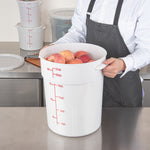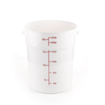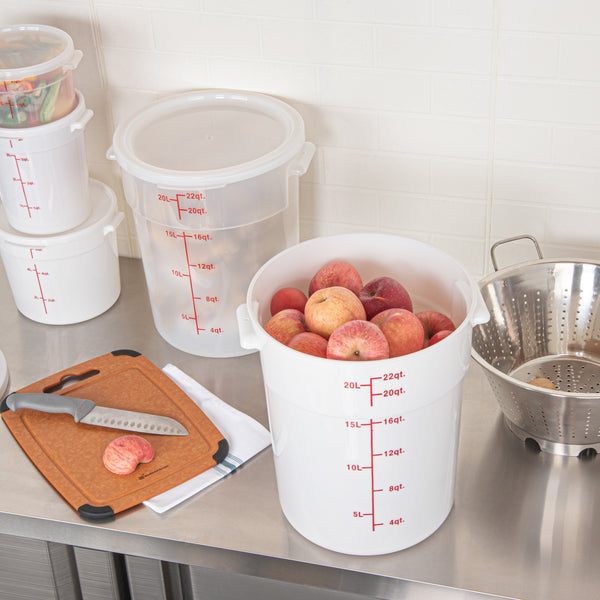 Organize and store your food items efficiently with our Met Lux 22-quart Round White Plastic Food Storage Container. Durably designed, this food storage container is crafted from robust PP plastic, ensuring prolonged use and withstanding wear and tear. The red graduations on this plastic food storage container ensure your ingredients are perfectly portioned every time. Easily lift and transport this food container with its stable handle, designed for optimal user comfort and convenience. This round plastic food container is dishwashable, making clean-up quick and easy after use. Plus, this storage container can be stored in the freezer and can withstand temperatures ranging from -40 to 160 degrees Fahrenheit, making it perfect for a variety of food items. The white design of this food container allows you to easily identify content, enhancing kitchen efficiency. This round plastic container has a generous capacity of 22 quarts, perfect for storing large quantities of food. Measuring 12.25 inches in diameter by 15 inches in height, this plastic food container optimizes storage space without compromising on content volume. Pair this container with a lid (SKU: RWT1579C-1) that is available to ensure food stays fresh. Sold in a 1 count box. Lid is available and sold separately.