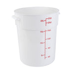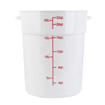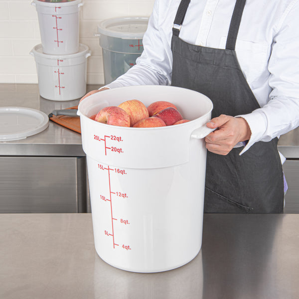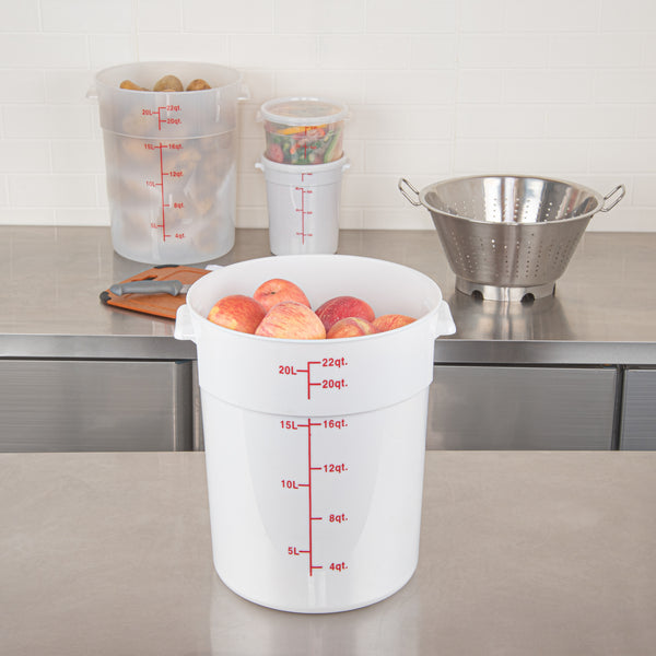 Organize and store your food items efficiently with our Met Lux 22-quart Round White Plastic Food Storage Containers. Durably designed, these food storage containers are crafted from robust PP plastic, ensuring prolonged use and withstanding wear and tear. The red graduations on these plastic food storage containers ensure your ingredients are perfectly portioned every time. Easily lift and transport these food containers with their stable handles, designed for optimal user comfort and convenience. These round plastic food containers are dishwashable, making clean-up quick and easy after use. Plus, these storage containers can be stored in the freezer and can withstand temperatures ranging from -40 to 160 degrees Fahrenheit, making them perfect for a variety of food items. The white design of these food containers allows you to easily identify content, enhancing kitchen efficiency. These round plastic containers have a generous capacity of 22 quarts, perfect for storing large quantities of food. Measuring 12.25 inches in diameter by 15 inches in height, these plastic food containers optimize storage space without compromising on content volume. Pair these containers with lids (SKU: RWT1579C) that are available to ensure food stays fresh. Sold in a 10 count box. Lids are available and sold separately.