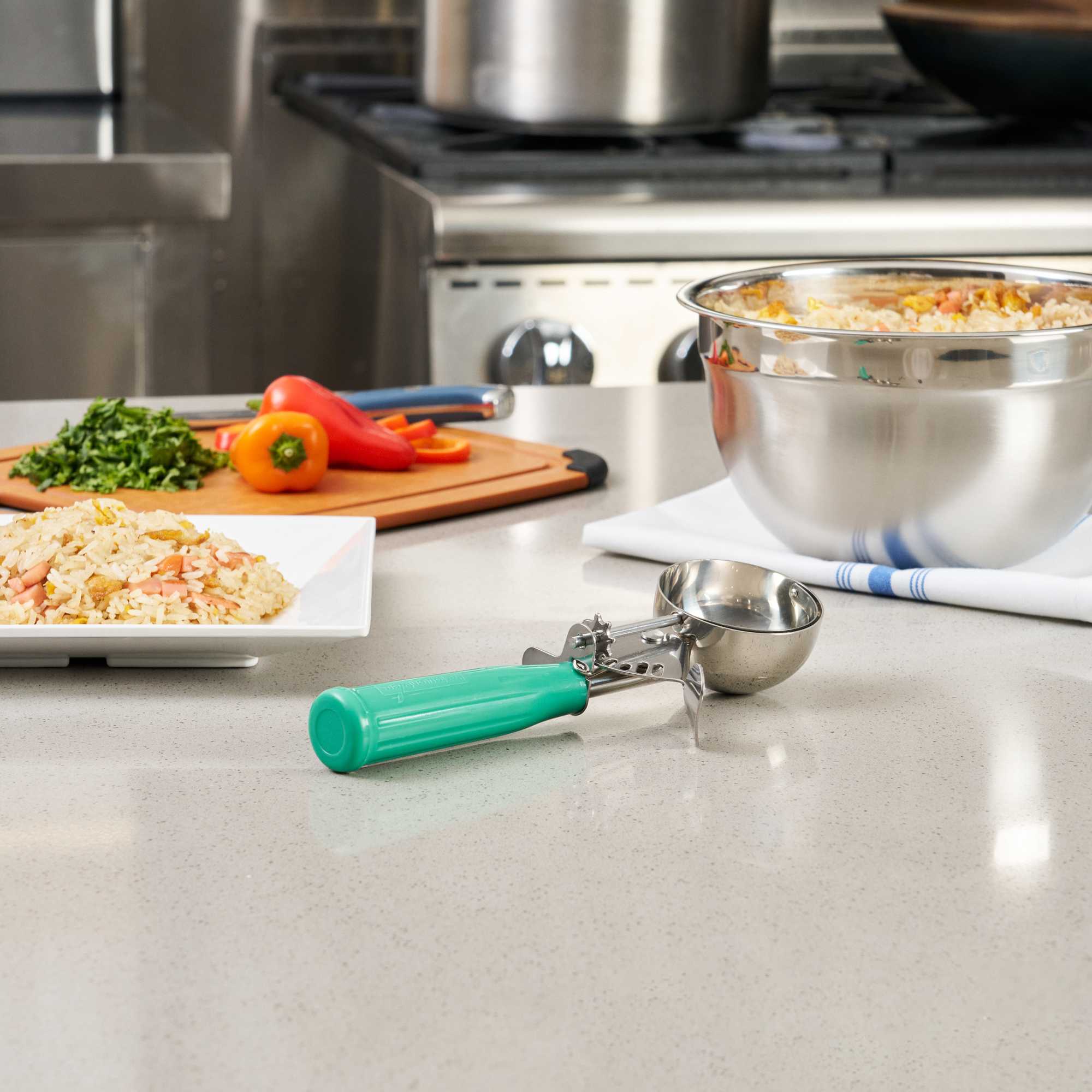 Available in a variety of colors and sizes, these food disher scoops satisfy all of your needs. Plus, the color-coded handle makes it easy to spot them in your kitchen drawer!