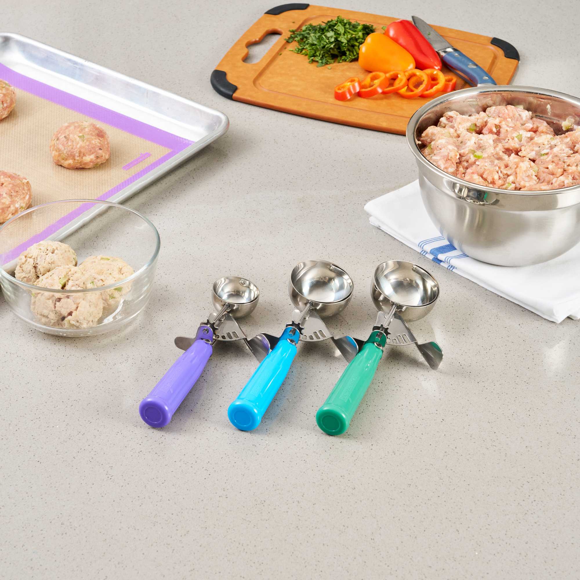Ideal for preparing evenly baked desserts and accurately portioned meals! These scoops with trigger allow you to easily scoop cookie dough, cupcake batter, meatballs, mashed potatoes, and more in seconds.