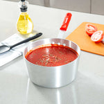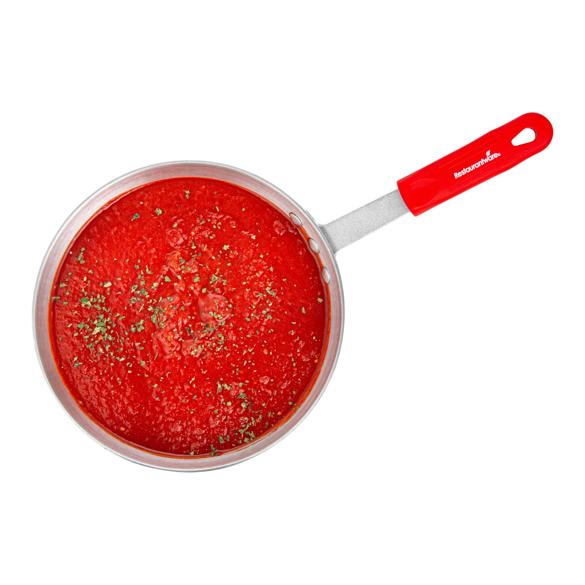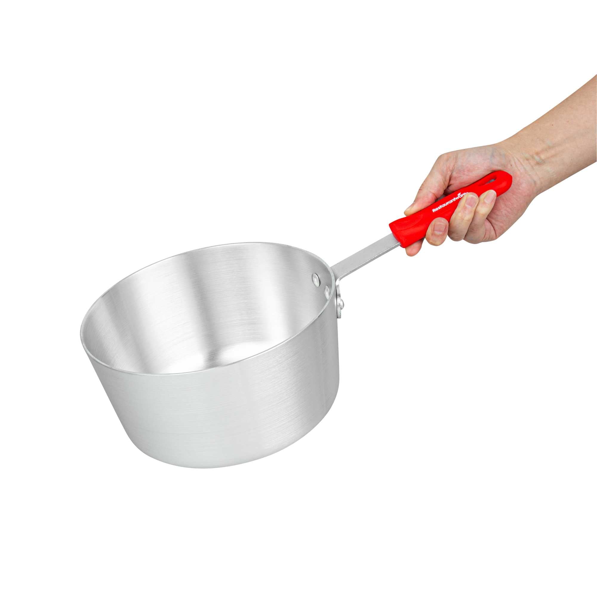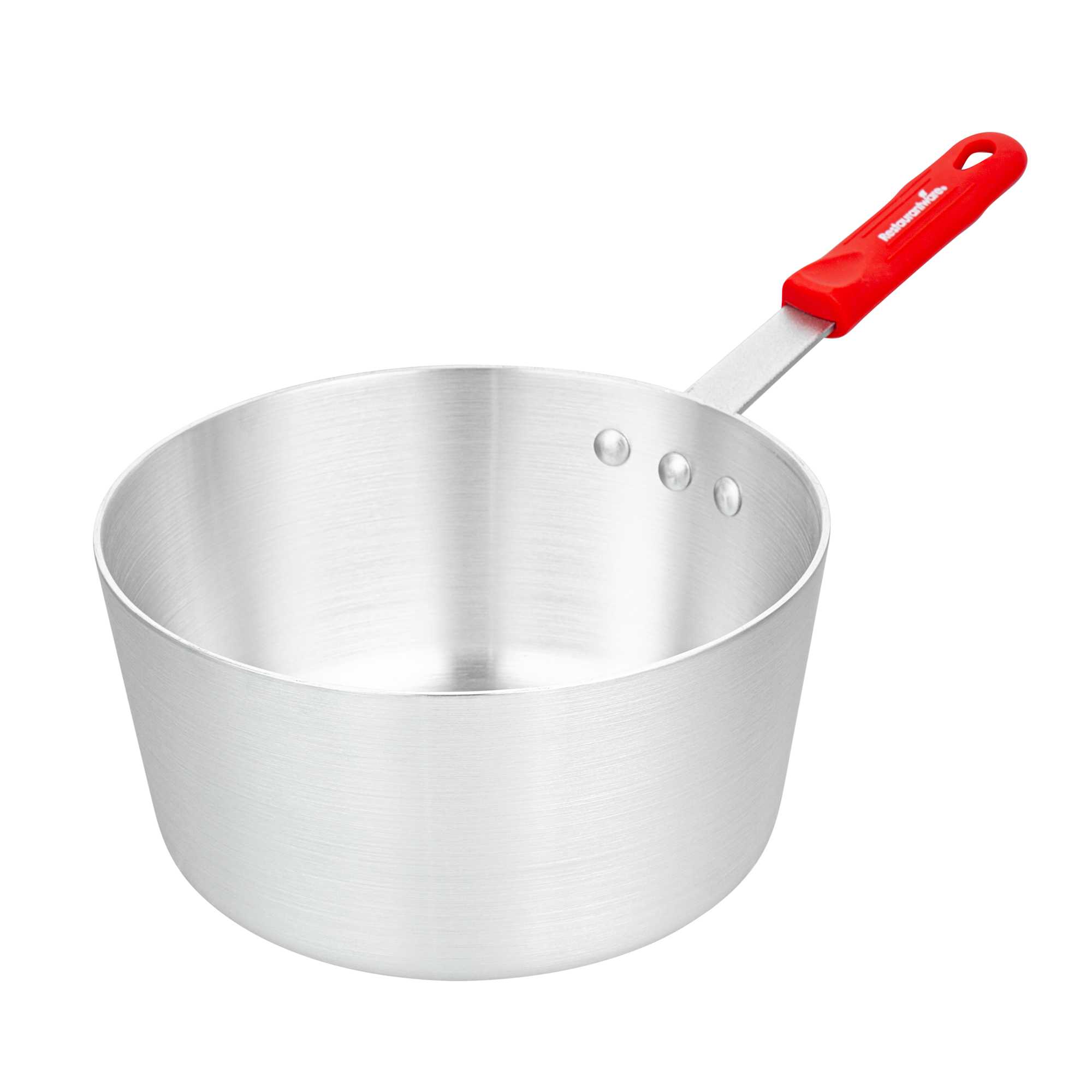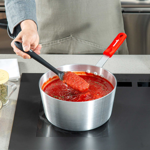 Ensure precise cooking with even heat distribution. The Met Lux Tapered Aluminum Sauce Pan offers a tapered design that promotes even cooking and reduces energy costs, making it ideal for simmering sauces and boiling liquids in both commercial kitchens and home settings. Constructed from 3003 series, 2.5 millimeter thick aluminum, this 3.75 quart aluminum saucepot ensures consistency and reliability by resisting warping, while its riveted handle guarantees durability for high-volume use. The ergonomic grip of the saucepan with silicone handle enhances kitchen safety, as the red silicone sleeve stays cool to the touch, minimizing burn risks and allowing safe handling. With dimensions of 15.75 inches in length, this pan supports versatile cooking applications by being oven safe and compatible with standard lids (sold separately). Elevate your kitchen’s efficiency and safety with this essential cookware. Sold in a 1 count box.