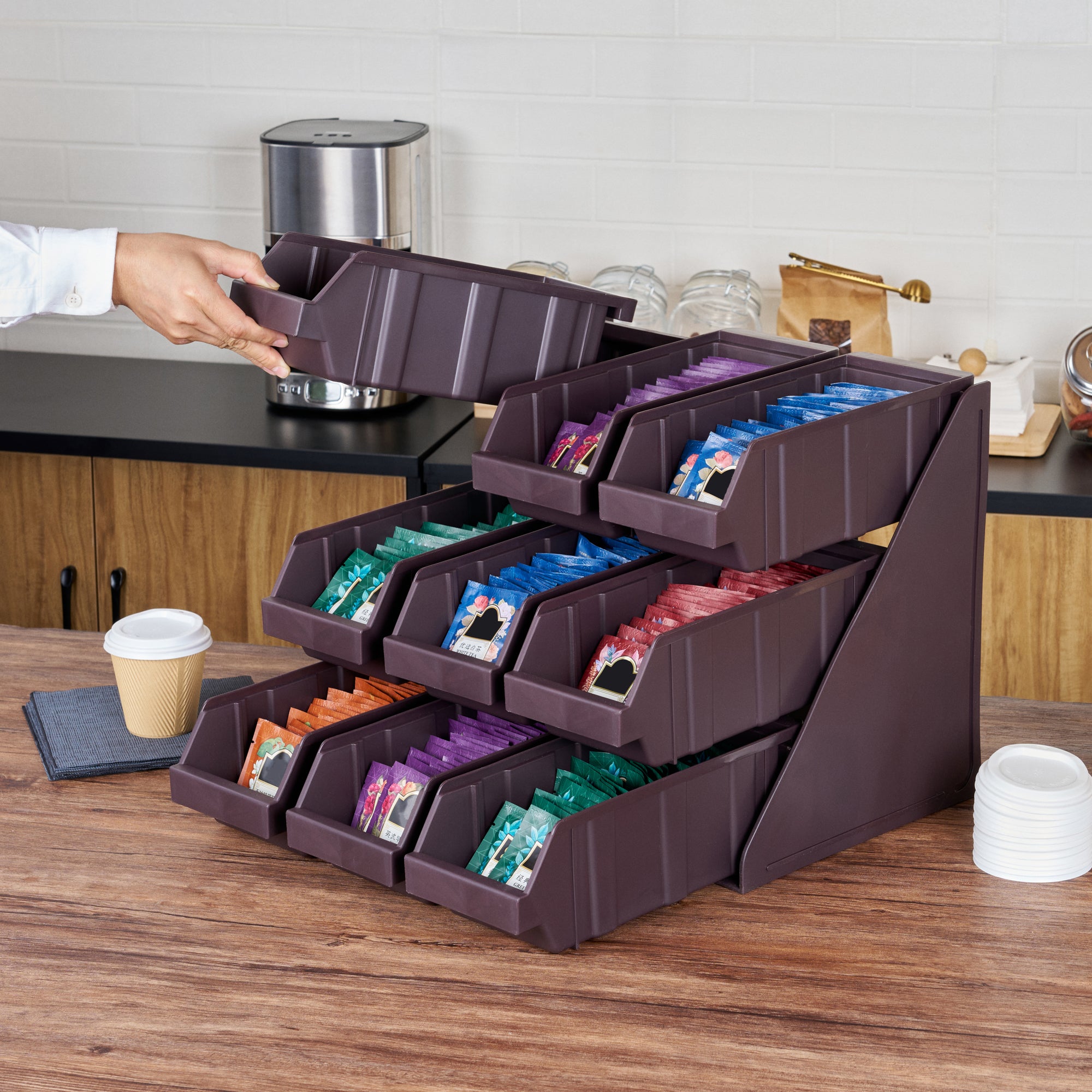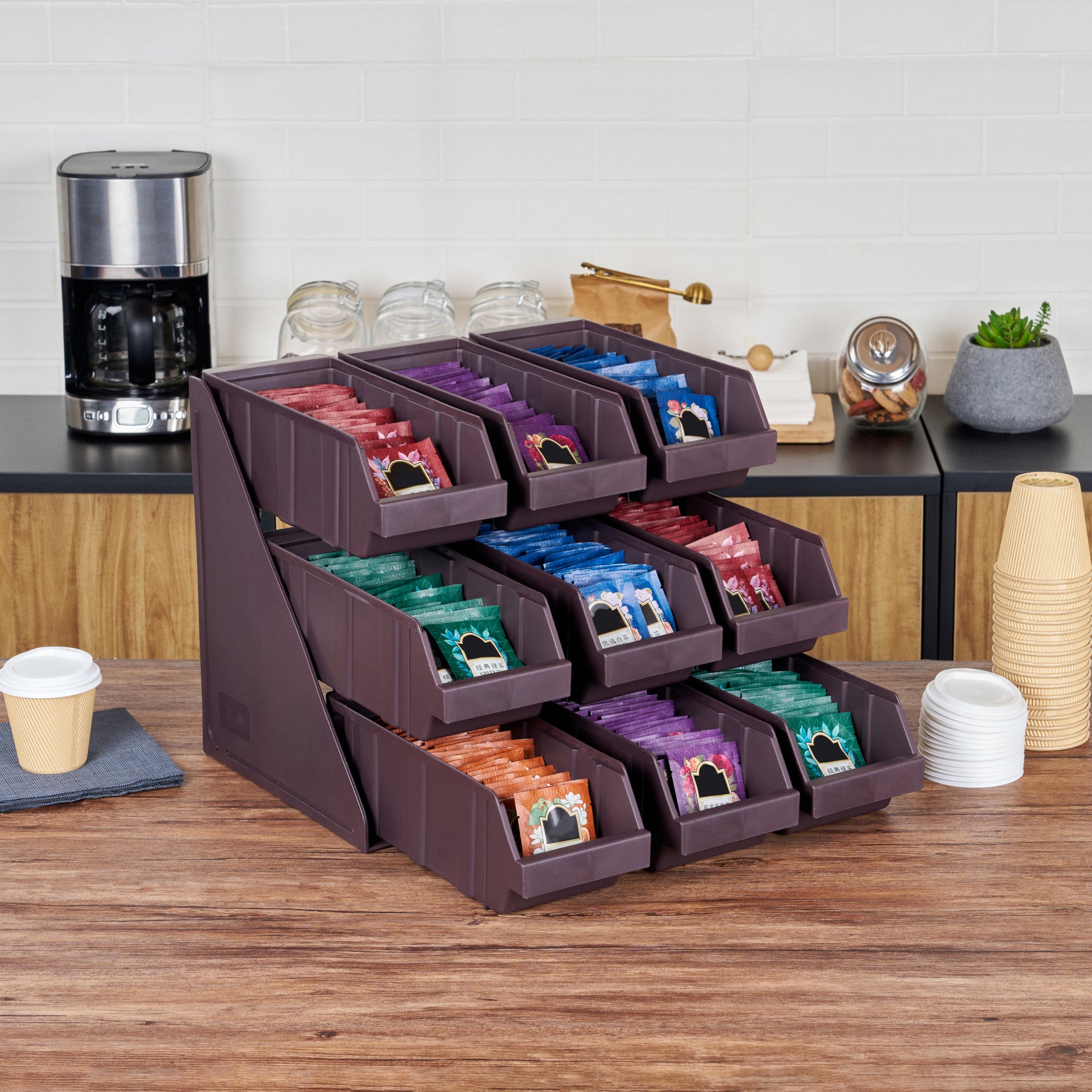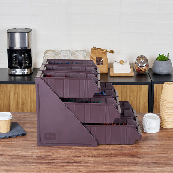 Elevate your foodservice setup with our Bundle: Met Lux 3 Brown 3-Tier Stands and 9 Condiment Bins and 8 Connector Clips, designed to streamline your operations with style and efficiency. This comprehensive bundle includes three durable brown plastic 3-tier stands, nine condiment bins, and eight connector clips, providing a complete solution for self-serve beverage stations or take-out order preparation areas. The vertical design of the stands maximizes counter space, allowing you to optimize your workspace while maintaining a sleek appearance. Each stand's brown finish blends seamlessly with various decor styles, ensuring a professional look in any setting. The versatile plastic stands can be easily combined using the included connector clips, offering customizable configurations to suit your needs. Ideal for organizing condiments, utensils, or small food items, this bundle enhances customer experience and improves operational efficiency. The condiment bins and connecter clips provided with these stands allow you to streamline the organization of products. The stands measure 11.57 inches in length by 5.59 inches in width by 13.78 inches in height, providing ample space for storage and display. Each order includes 3 brown 3-tier stands, 9 condiment bins, and 8 connector clips.