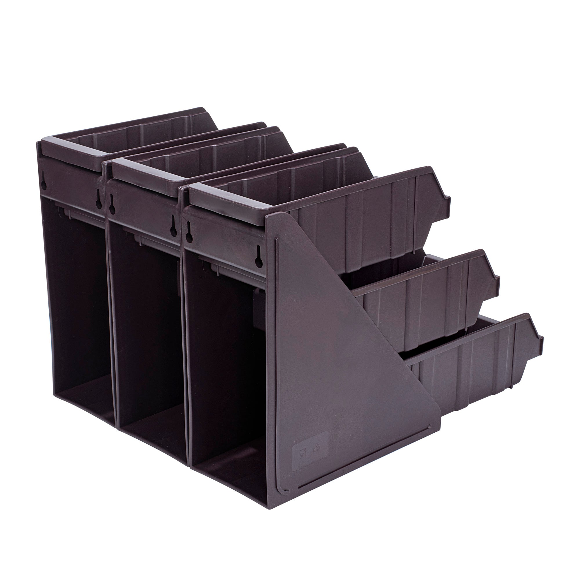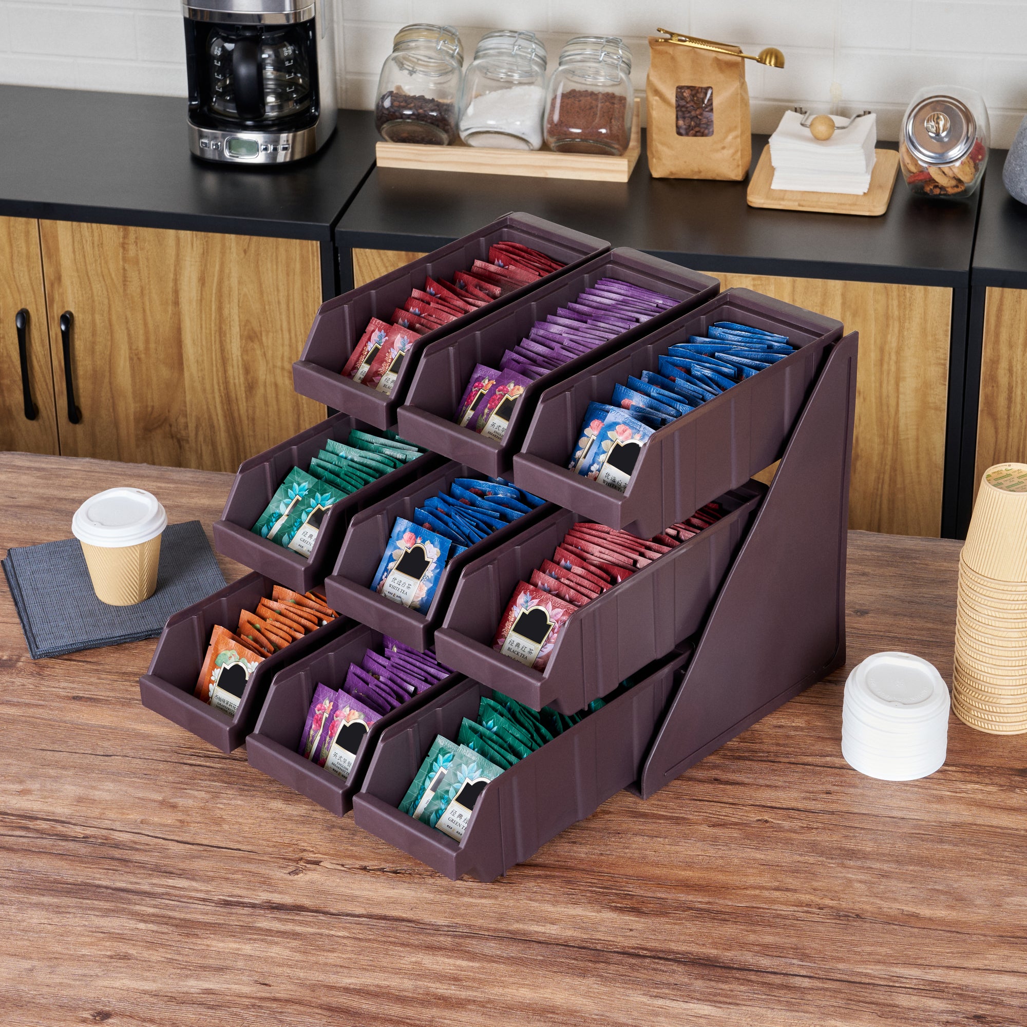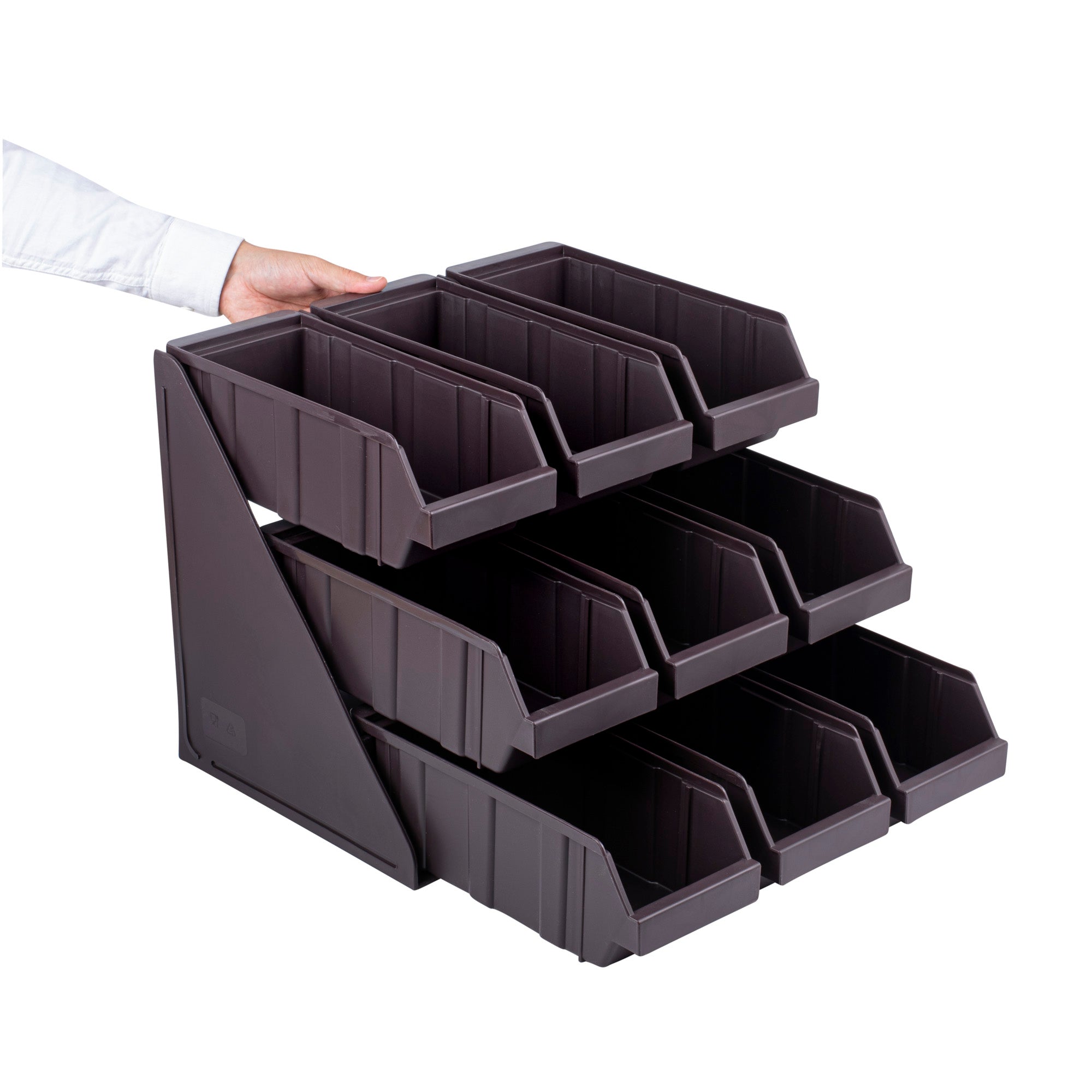 Elevate your foodservice setup with our Bundle: Met Lux 3 Brown 3-Tier Stands and 9 Condiment Bins and 8 Connector Clips, designed to streamline your operations with style and efficiency. This comprehensive bundle includes three durable brown plastic 3-tier stands, nine condiment bins, and eight connector clips, providing a complete solution for self-serve beverage stations or take-out order preparation areas. The vertical design of the stands maximizes counter space, allowing you to optimize your workspace while maintaining a sleek appearance. Each stand's brown finish blends seamlessly with various decor styles, ensuring a professional look in any setting. The versatile plastic stands can be easily combined using the included connector clips, offering customizable configurations to suit your needs. Ideal for organizing condiments, utensils, or small food items, this bundle enhances customer experience and improves operational efficiency. The condiment bins and connecter clips provided with these stands allow you to streamline the organization of products. The stands measure 11.57 inches in length by 5.59 inches in width by 13.78 inches in height, providing ample space for storage and display. Each order includes 3 brown 3-tier stands, 9 condiment bins, and 8 connector clips.