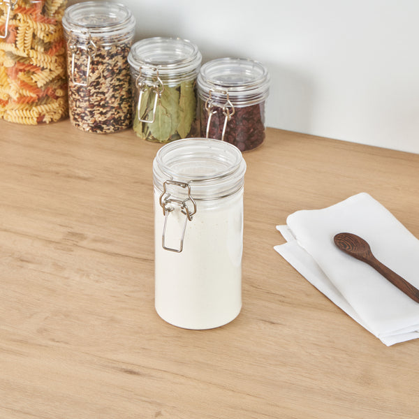 Enhance your kitchen organization with our Met Lux 32-ounce Round Clear Plastic Storage Jars. The hinged top lid of these clear jars offers easy access without the need for unscrewing. These plastic storage containers feature a rubber gasket, providing an airtight seal to keep contents protected from contaminants. Crafted from premium plastic, these kitchen canisters are durable and sturdy, ensuring reliable storage for various items. With a wide-mouth design, these storage jars allow for easy filling, scooping, and cleaning, making them incredibly convenient for everyday use. The versatile design of these plastic containers with lids is ideal for storing dry spices, herbs, and baking ingredients, catering to all your culinary needs. With a clear finish, these plastic jars are visually appealing and allow for easy identification of contents, ensuring your storage area remains organized and clutter-free. These plastic containers have a capacity of 32 ounces and measure 3.66 inches in diameter by 7.2 inches in height, perfect for accommodating a large quantity of items. Sold in a 2 count box.