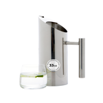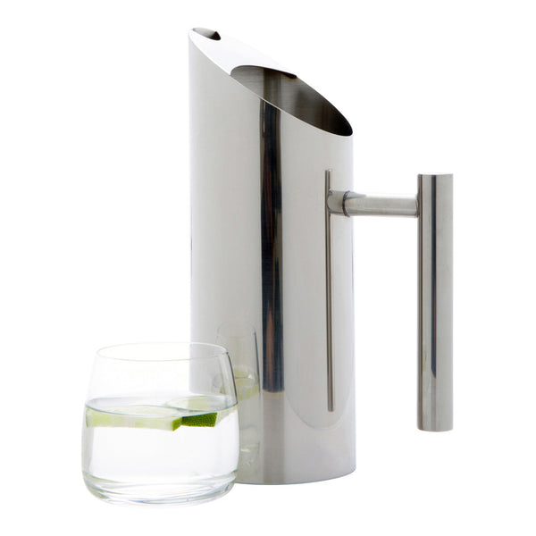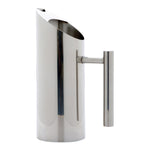 Upgrade your beverage service with this modern design-inspired Met Lux Stainless Steel Water Pitcher. Merging sleek lines with contemporary design, this stainless steel carafe is a striking addition to any venue or establishment. Its unique, cylindrical handle provides a secure way to transport your beverages, while its built-in ice guard enables precise and splatter-free pouring. Constructed from high-quality stainless steel, this polished silver water pitcher is intended to withstand commercial use in restaurants, cafes, catering companies, and other foodservice establishments. Each of these metal water pitchers has a total capacity of 33 ounces. Sold in a 1 count box.