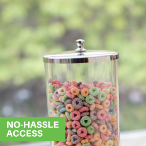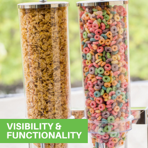 These portion control dispensers have clear canisters for premium visibility and let you see your cereal or candy levels. Provides you with a quick and effortless way to keep track of your dry food level for easy refills!