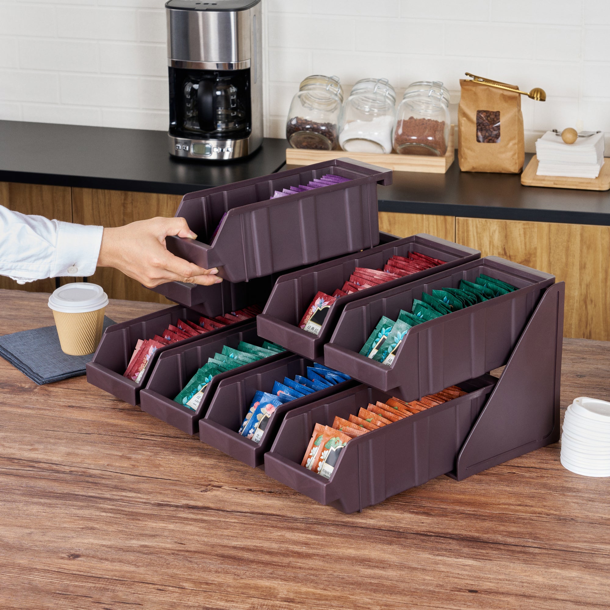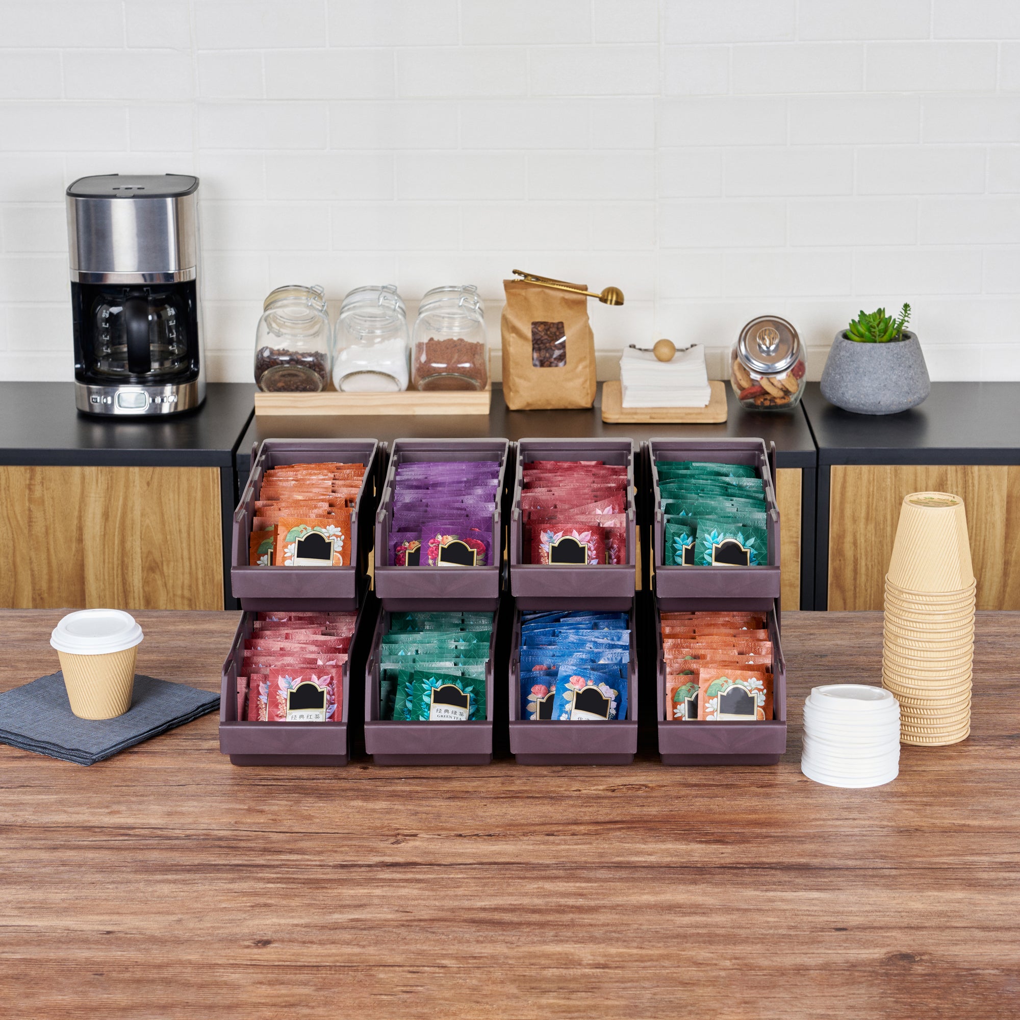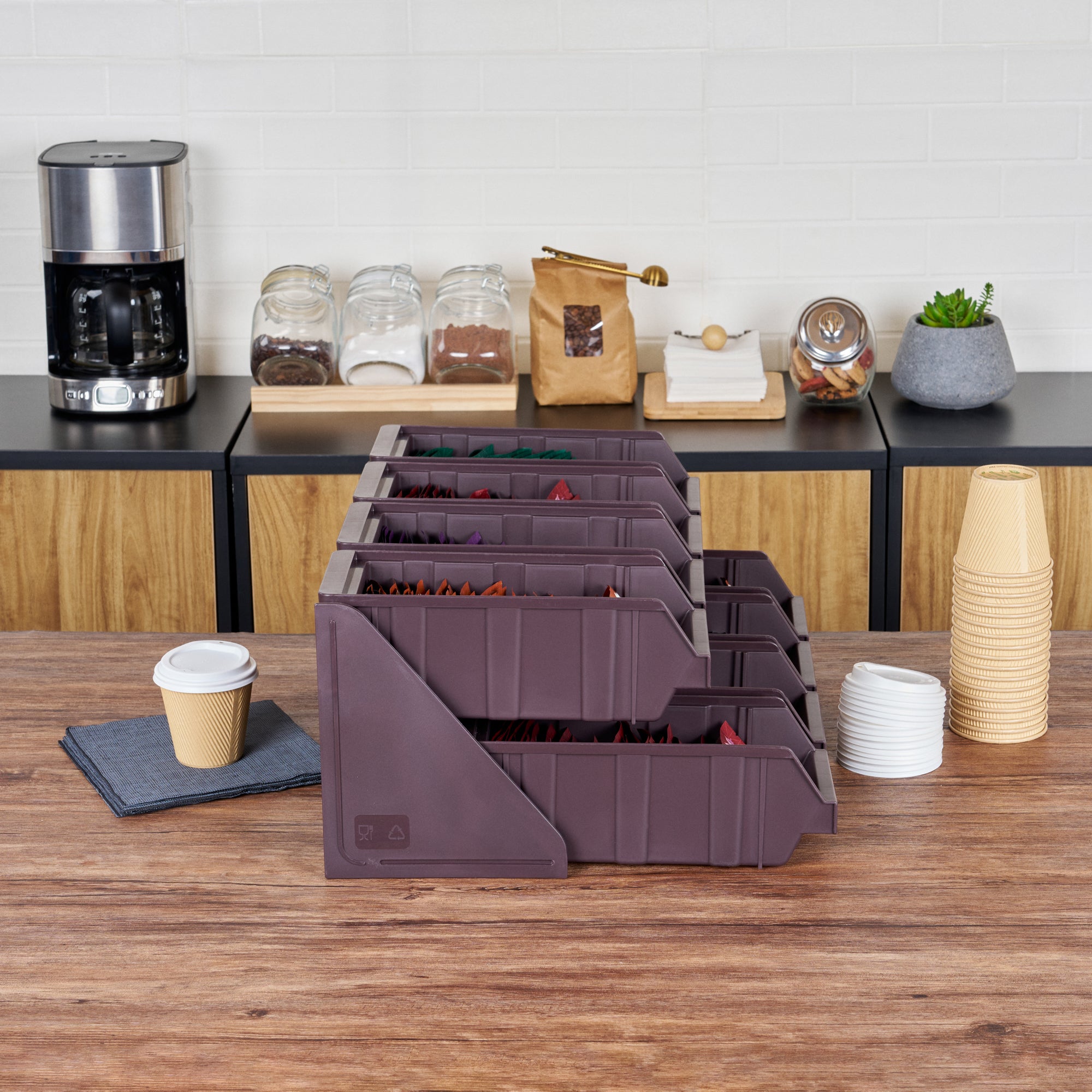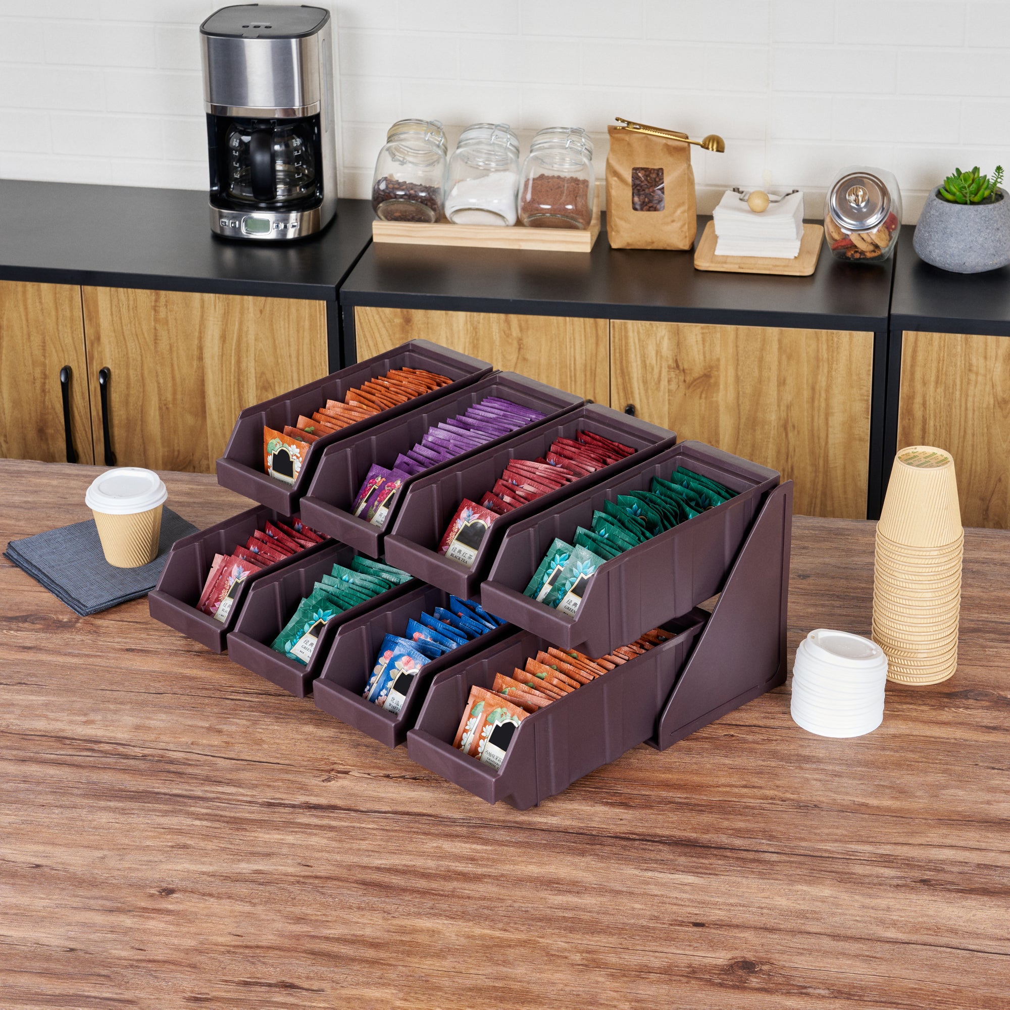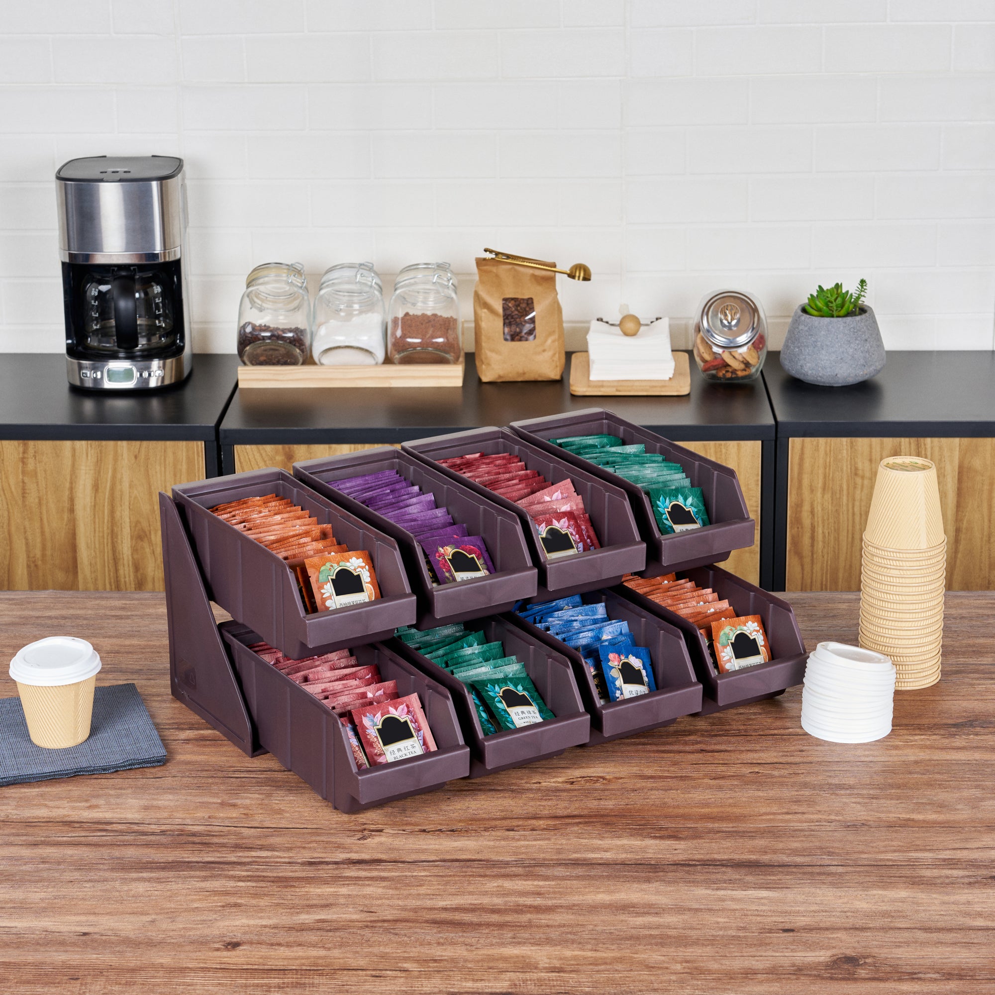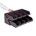 Revolutionize your foodservice setup with our Bundle: Met Lux 4 Brown 2-Tier Stands and 8 Condiment Bins and 12 Connector Clips, designed to streamline operations and enhance customer experience. This comprehensive bundle includes four durable 2-tier stands, eight condiment bins, and twelve connector clips, providing a complete solution for self-serve beverage stations or take-out order preparation areas. The brown plastic stands feature a vertical design that maximizes counter space efficiency while offering unparalleled convenience for both staff and customers. Easily customize your setup by combining stands using the included connector clips, allowing for flexible configurations to suit your specific needs. The stylish brown finish of these stands seamlessly blends with various decor, ensuring a professional and cohesive look in any foodservice environment. These 2-tier stands measure 7.68 inches in length by 5.59 inches in width by 9.09 inches in height, making them perfect for tight spaces while still providing ample room for condiments and supplies. Each order includes 4 brown 2-tier stands, 8 condiment bins, and 12 connector clips.