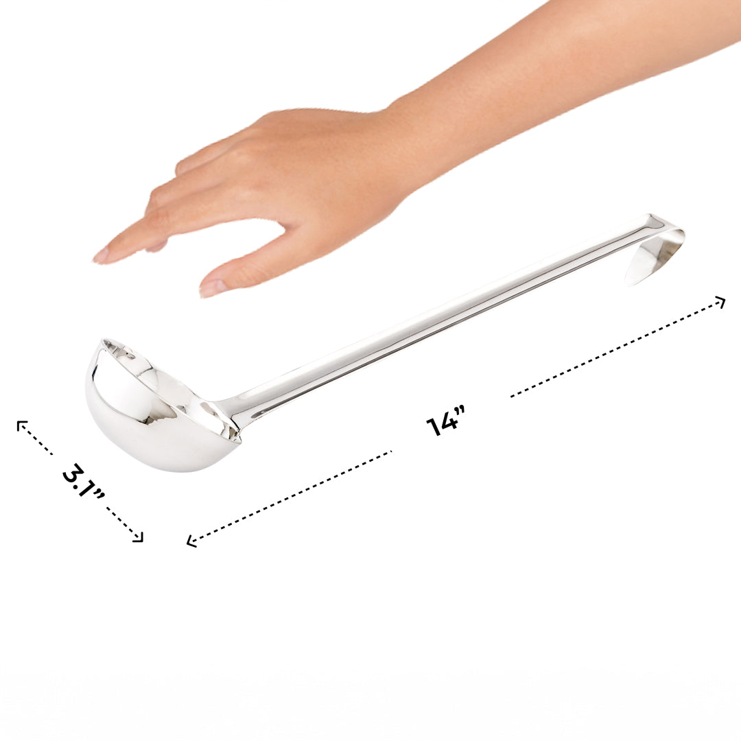 Dress up your dishes with our Met Lux 4-Ounce Stainless Steel Heavy-Duty Serving Ladle. Crafted with stainless steel, this serving ladle offers superior strength to resist daily wear and tear without the risk of rusting or corroding over time. With a 4-ounce capacity, this stainless steel spoon guarantees uniform servings of your delectable sauces. This serving spoon features a long ergonomic handle to provide a secure and comfortable grip while serving. Dishwasher-safe, this sauce spoon makes the cleaning process straightforward and convenient. Measuring 14 inches long by 3 inches wide by 1.25 inches tall, this soup spoon can hold up to 4 ounces. Sold in a 1 count box.