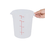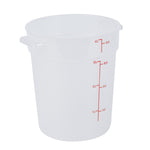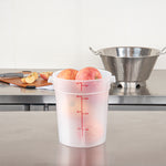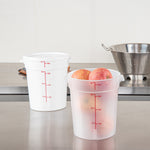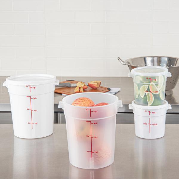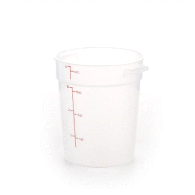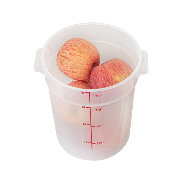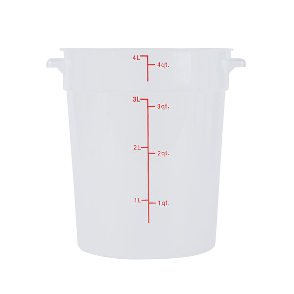 Our Met Lux 4-quart Round Translucent Plastic Food Storage Containers are a must-have addition to any bustling kitchen or foodservice establishment. Crafted from durable PP plastic, these food storage containers are designed to withstand temperatures ranging from -40 to 160 degrees Fahrenheit, perfect for storing a variety of foods. The round plastic food containers possess a unique feature, red volume markers, which aid in accurate measurements to ensure consistency in your culinary creations. Equipped with stable handles, these storage containers are easy to carry, reducing the risk of spills or accidents in your busy kitchen. The translucent design of these food containers allows for quick and easy identification of contents, saving you valuable time during peak hours. Impressively versatile, these round plastic containers can be used in both the dishwasher and the freezer, making them a practical choice for all your food storage and cleaning needs. Boasting a generous 4-quart capacity, these round plastic containers can hold substantial amounts of food, while their dimensions of 7.25 inches in diameter by 8.5 inches in height make them easy to store and stack. Pair these containers with their compatible lids (SKU: RWT1572C) for a complete food storage solution. Sold in a 10 count box. Lids are available and sold separately.