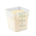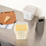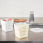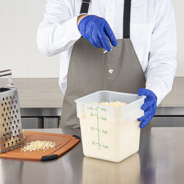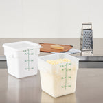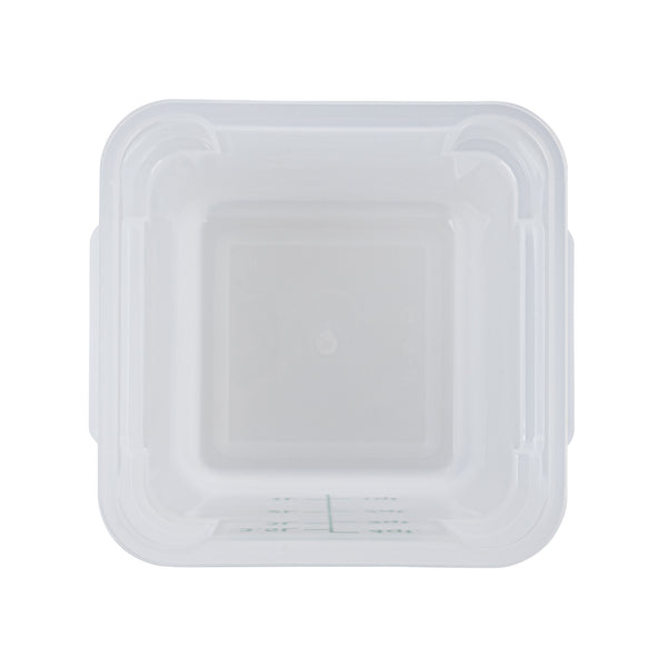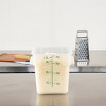 Ensure optimal kitchen efficiency with precise portion control. The Met Lux Graduated Food Storage Container features green graduations that enable accurate measuring, effectively reducing food waste and maximizing cost-efficiency. Constructed from durable plastic, this food storage container is designed to withstand the rigors of high-demand kitchen settings. With stable handles, this plastic food container ensures effortless transport, minimizing spillage even in the busiest of foodservice operations. Its translucent design allows for quick identification of contents, enhancing productivity and organization in fast-paced kitchens. Measuring 7 inches by 7 inches by 7.38 inches, this translucent storage container accommodates up to 4 gallons, making it ideal for both hot and cold foods. Enhance your kitchen operations with this indispensable container and experience seamless storage solutions. Each order includes 1 Met Lux Graduated Food Storage Container.