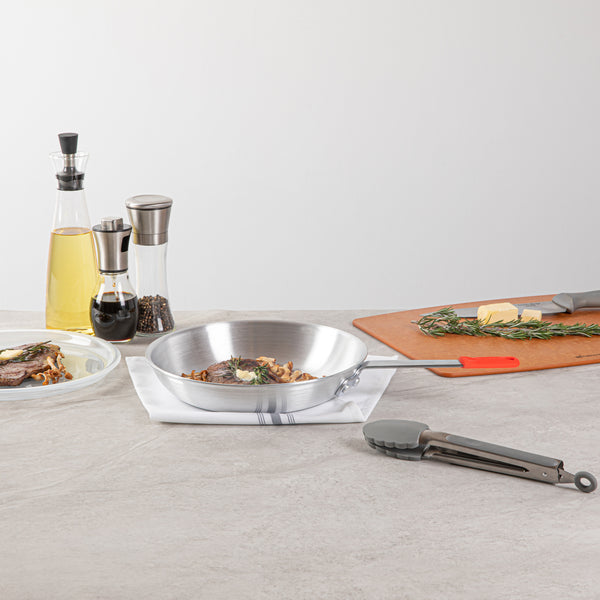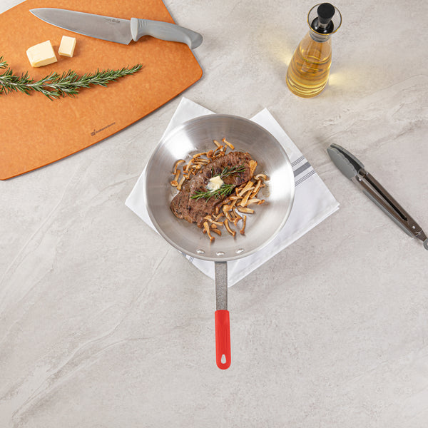 - Triple-riveted handle provides a secure grip and improved control while cooking