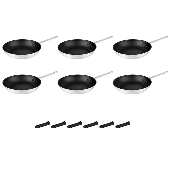 Elevate your kitchen's efficiency and safety with our Bundle: Met Lux 6 Aluminum 10" Non-Stick Fry Pans with 6 Black Silicone Pan Handle Sleeves. Featuring a non-stick surface, these skillet pans ensure effortless food release and quick cleanup, saving valuable time during hectic cooking sessions. Crafted from 3 mm thick aluminum, these fry pans ensure superior heat distribution, perfect for achieving optimal searing, browning, and frying results. Designed to be induction stovetop compatible, these aluminum skillets expand the range of culinary techniques you can master. The triple-riveted, sturdy handle of these aluminum fry pans provides a secure grip, enhancing control and maneuverability while cooking. These cooking pans feature a convenient hanging hole on their handle, facilitating easy storage and improving kitchen organization. Withstanding heat up to 450F, these removable handle sleeves ensure safe handling of hot pans, preventing burns during cooking. The molded indentations of these pan handle sleeves offer a firm grip, ensuring full control when frying or sauteing. With a removable design, these black silicone pan handle sleeves facilitate easy attachment and removal. Measuring 17.72 inches in length by 10.23 inches in width by 2.75 inches in height, these saute pans provide ample space for a variety of dishes. Each order includes 6 pans and 6 sleeves.