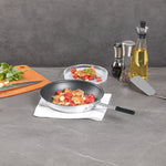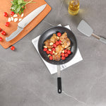 - 3 mm thick aluminum evenly distributes heat for consistent cooking results