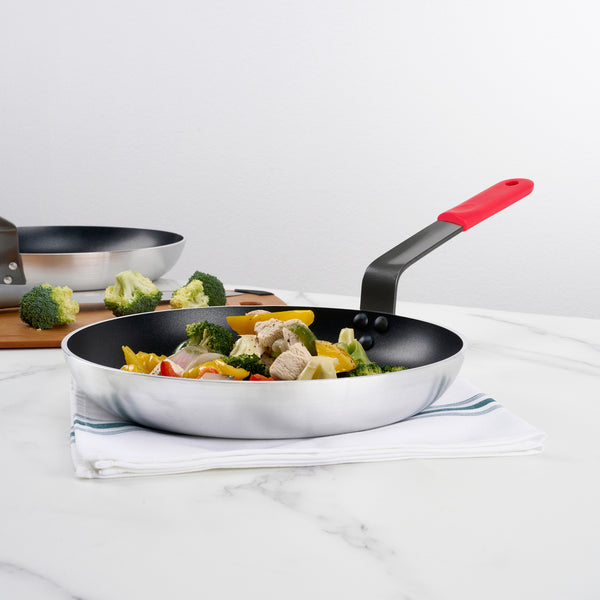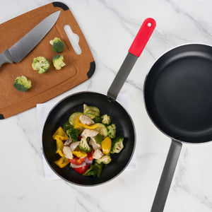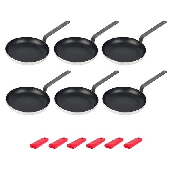 6 ALUMINUM 11" INDUCTION READY FRY PANS AND 6 RED SLEEVES