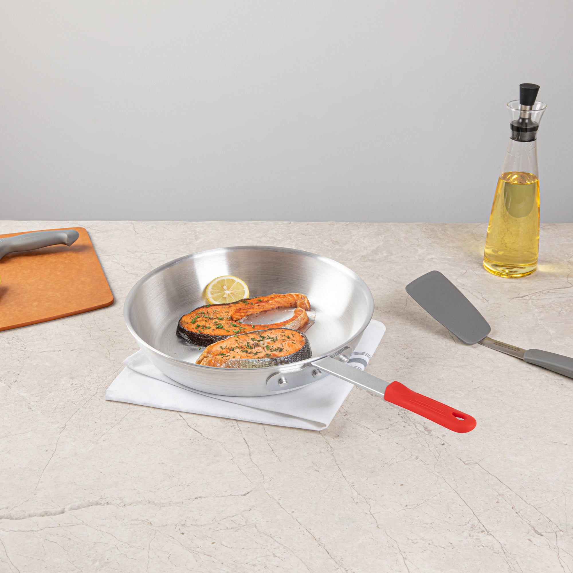 - Triple-riveted handle provides a secure grip and improved control while cooking