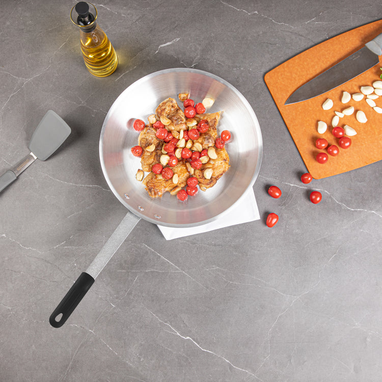 - Triple-riveted handle provides a secure grip and improved control while cooking