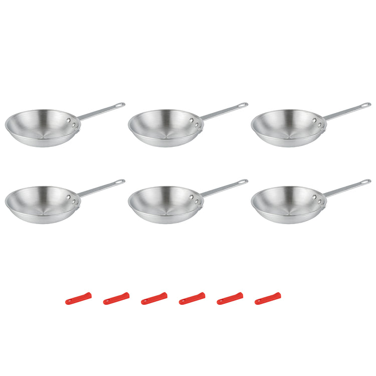6 ALUMINUM 8" FRY PANS AND 6 RED SLEEVES