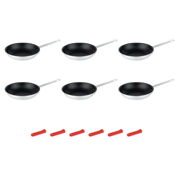6 ALUMINUM 8" NON-STICK FRY PANS AND 6 RED SLEEVES