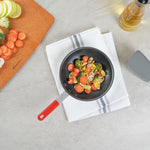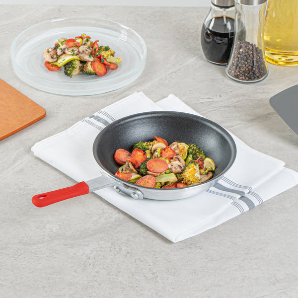 Elevate your kitchen efficiency with our Bundle: Met Lux 6 Aluminum 8" Non-Stick Fry Pans with 6 Red Silicone Pan Handle Sleeves. These frying pans are non-stick and ensure that your dishes release effortlessly and cook evenly, providing an exceptional cooking experience. Crafted from 3 mm thick aluminum, these skillet pans provide quick and efficient heat distribution, delivering consistent results every time. The sturdy, triple-riveted handle on these aluminum fry pans offers a secure grip and enhanced durability for long-lasting use. These fry pans are induction-ready, expanding their versatility across different cooking surfaces. Featuring a convenient hanging hole, these cooking pans allow for easy storage and accessibility within your kitchen. To maintain their pristine look, hand washing these non-stick pans is recommended. Capable of withstanding heat temperatures up to 450F, these pan handle sleeves protect your hands from burns, ensuring safe handling of hot cookware. With a removable design, these silicone sleeves allow for easy interchangeability between different pans, increasing kitchen efficiency and reducing clutter. The molded indentations on these removable handle sleeves provide a secure grip, minimizing accidental slippage while maneuvering your pans. Measuring 12.99 inches in length by 7.87 inches in width by 2.28 inches in height, these aluminum cooking pans provide ample space for a variety of culinary creations. Each order includes 6 pans and 6 sleeves.