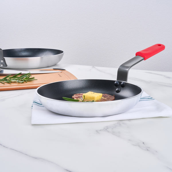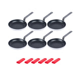6 ALUMINUM 9" INDUCTION READY FRY PANS AND 6 RED SLEEVES