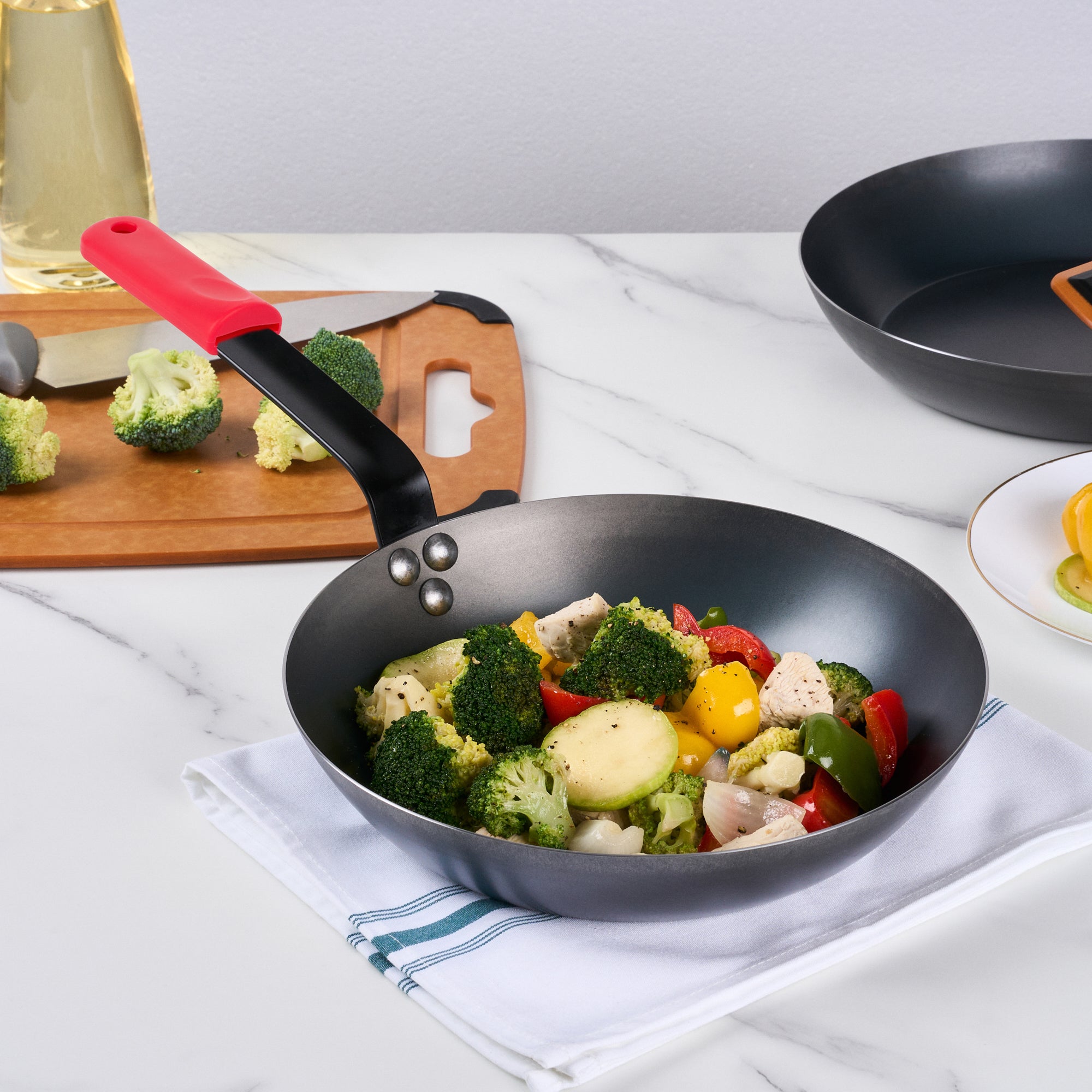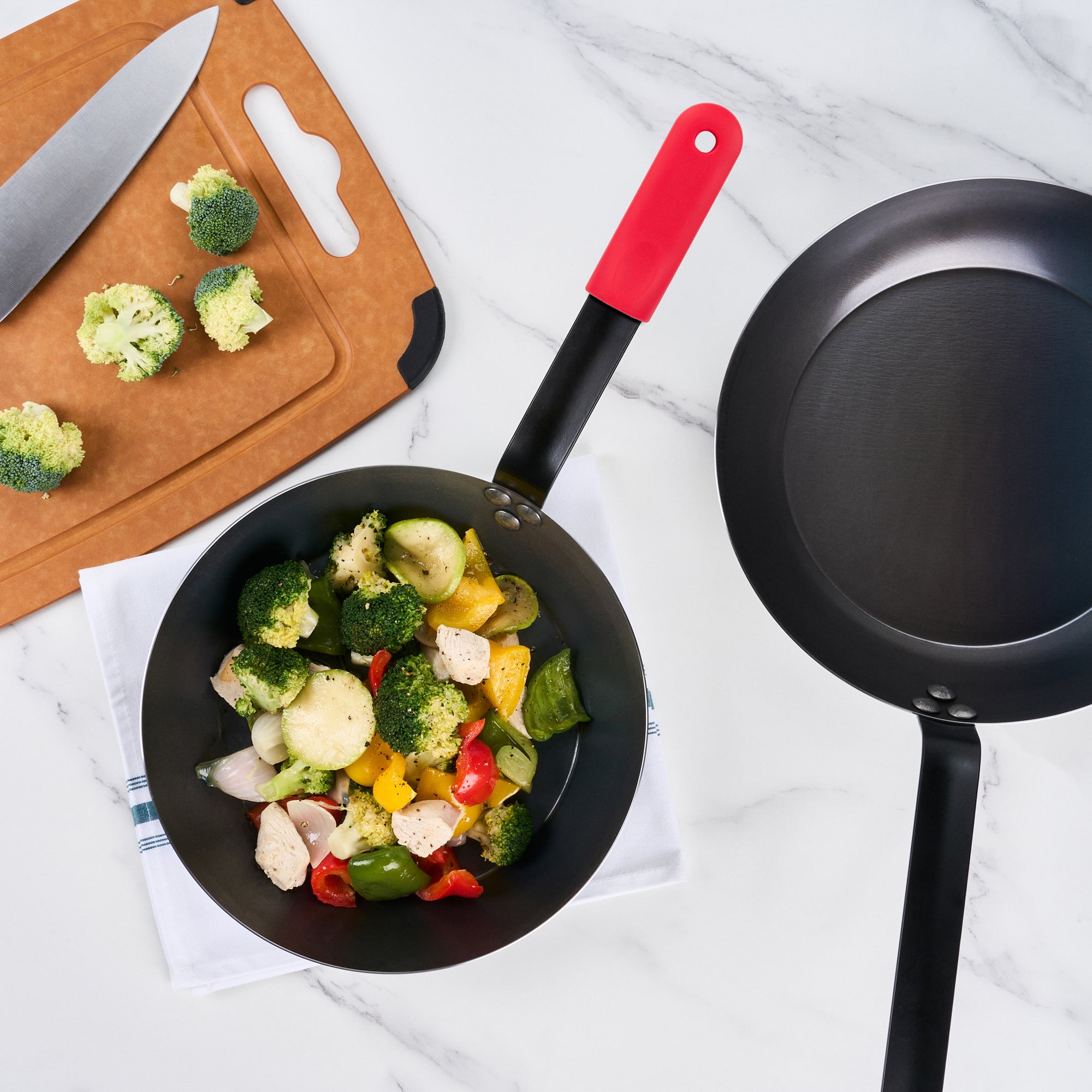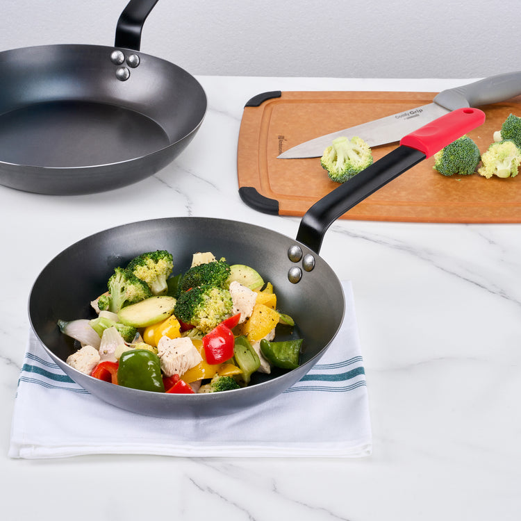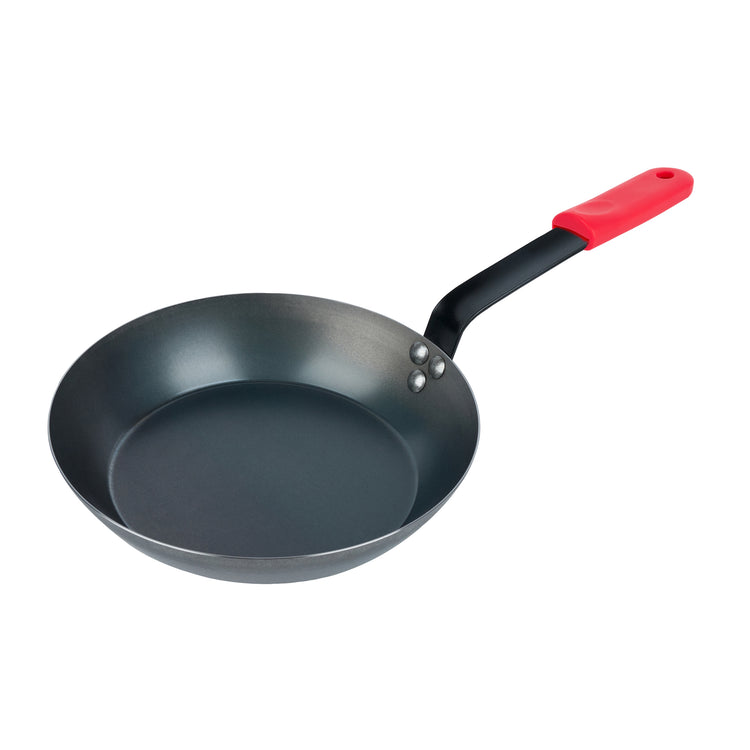 Enhance your culinary prowess with our Met Lux 6 Black Carbon Steel 10" Pre-Seasoned Fry Pans with 6 Red Silicone Pan Handle Sleeves. These cooking pans are non-coated and avoid food from sticking, providing effortless food release and cleanup. Meticulously crafted from 1.5 mm thick carbon steel, these frying pans ensure superior heat distribution, providing even cooking results for all your dishes. Designed to be induction-compatible, these skillet pans broaden your cooking possibilities. The triple-riveted handles of these carbon steel fry pans provide secure grips, enhancing ease and comfort during use. With convenient hanging holes, these kitchen skillets offer efficient storage solutions, ideal for maximizing space in busy kitchen environments. These pan handle sleeves are heat-resistant up up to 450F, safeguarding your hands from burns and enhancing kitchen safety. The molded indentations of these removable handle sleeves offer firm and comfortable grips for secure handling of hot pans. With removable designs, these silicone pan handle sleeves allow for effortless attachment and detachment, facilitating quick transitions between pans for efficient cooking. Measuring 18.31 inches in length by 10.25 inches in width by 4.06 inches in height, these 10-inch fry pans provide ample cooking space for a variety of dishes, accommodating all your culinary needs. Each order includes 6 pans and 6 sleeves.