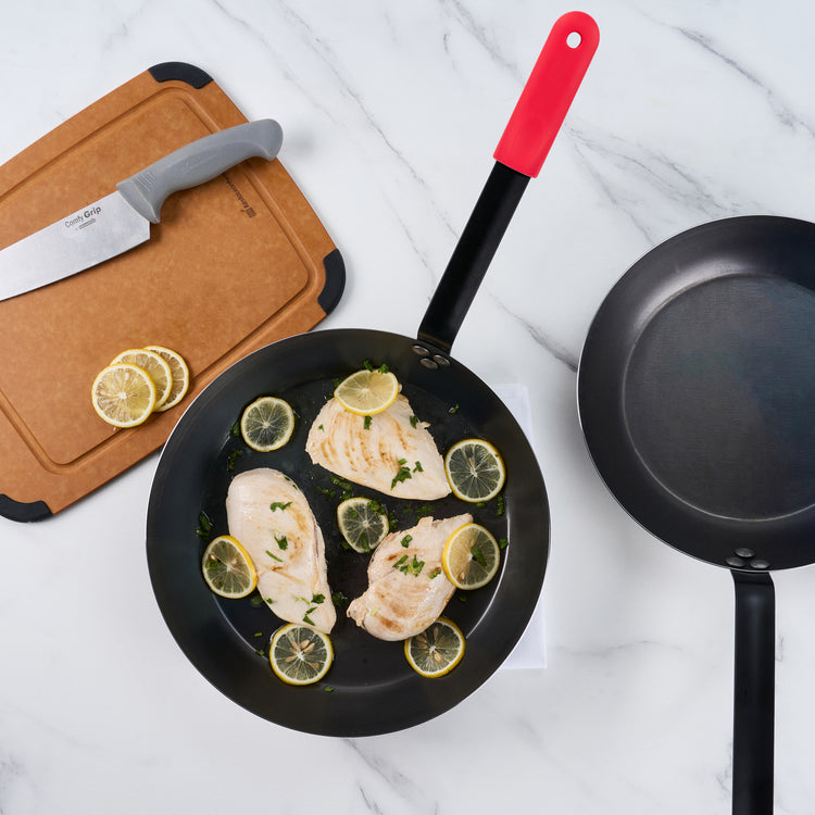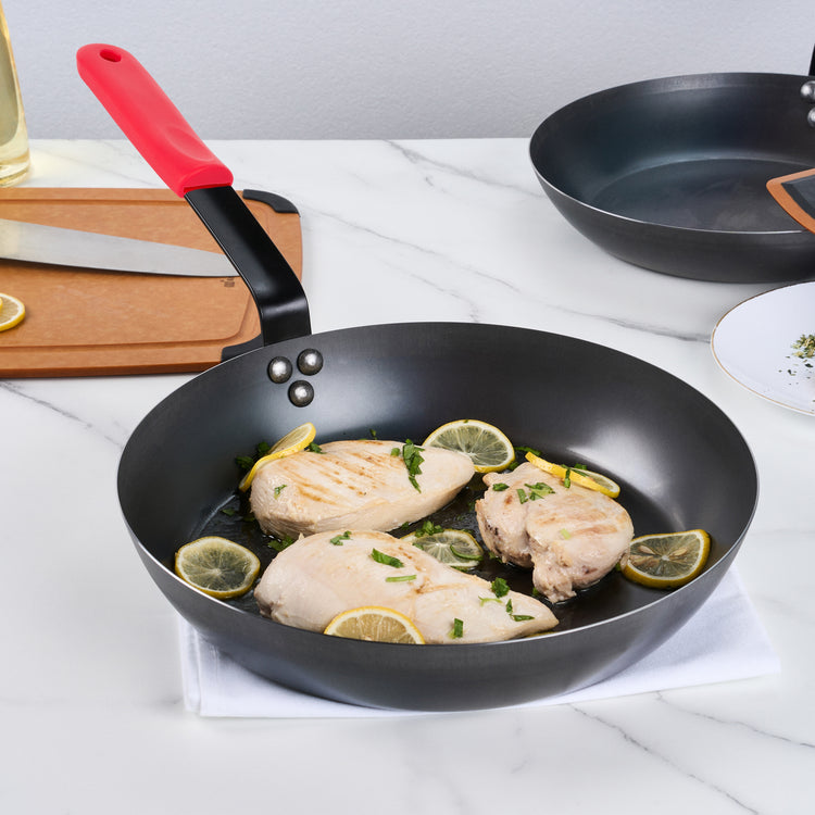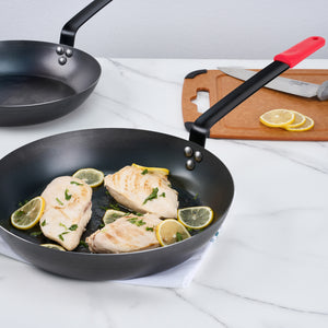 Experience the best of cooking with our Bundle: Met Lux 6 Black Carbon Steel 13" Pre-Seasoned Fry Pans with 6 Red Silicone Pan Handle Sleeves. Made from 1.5 mm thick carbon steel, these fry pans ensure even heat distribution for perfectly cooked dishes every time. With impressively lightweight designs, these carbon steel fry pans offer exceptional comfort and control, making them ideal for long cooking sessions. The non-coated surfaces of these frying pans are suitable for searing and browning, bringing out the best flavors in your ingredients. Equipped with sturdy, triple-riveted handles, these skillet pans provide secure grips, reducing the risk of accidents in busy kitchen environments. For added convenience, the carbon steel skillets include hanging holes for efficient storage. These removable handle sleeves provide heat resistance up to 450F to protect your hands from burns while handling hot cookware. Featuring molded indentations, these silicone pan handle sleeves provide firm and comfortable grips for easy handling of hot pans. Each pan handle sleeve is removable and offers easy attachment and detachment, allowing for quick transitions between pans. These 13-inch fry pans measure 22.84 inches in length by 12.6 inches in width by 4.8 inches in height, including the handles, offering ample space for frying various dishes. Each order includes 6 pans and 6 sleeves.