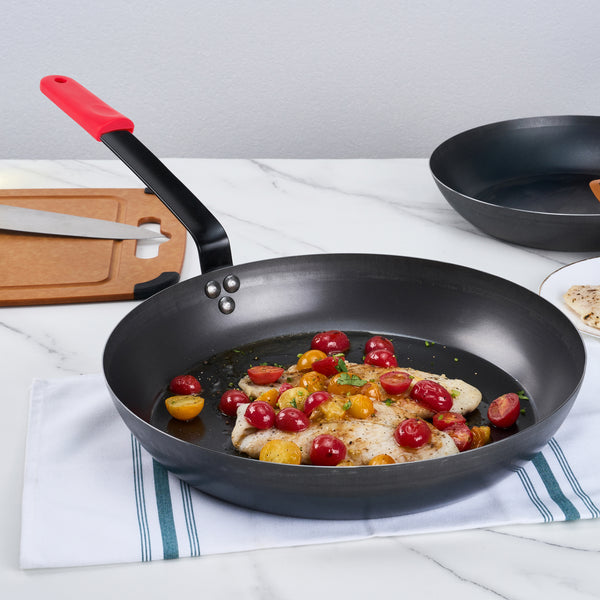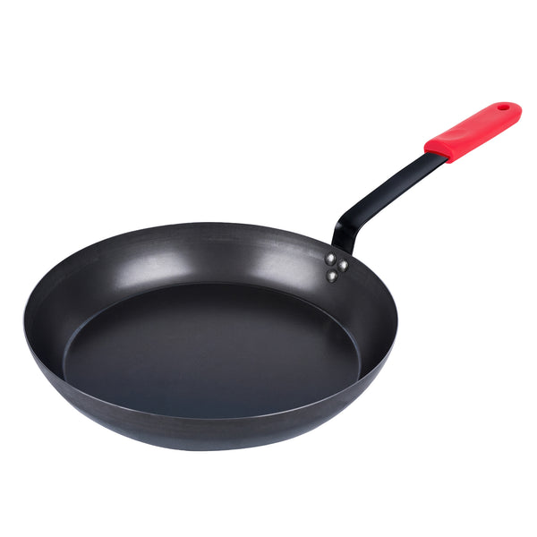 Enhance your kitchen efficiency with our Met Lux 6 Black Carbon Steel 14" Pre-Seasoned Fry Pans with 6 Red Silicone Pan Handle Sleeves. Crafted from robust 1.5 mm thick carbon steel, these pre-seasoned frying pans ensure long-lasting durability and excellent heat distribution for perfectly cooked dishes. Lightweight and easy to maneuver, these fry pans allow you to flip and stir your meals effortlessly. With non-coated surfaces, these carbon steel fry pans are ideal for searing and browning, giving your dishes a professional touch. The triple-riveted handles of these skillet pans provide comfortable and secure grips, enhancing safety during handling. For additional convenience, the handles of these carbon steel pans include hanging holes, allowing for easy storage and saving valuable kitchen spaces. These silicone sleeves are heat-resistant up to 450F, providing reliable protection for your hands from burns while handling hot cookware. The molded indentations of these pan handle sleeves allow for quick and easy attachment and detachment, making pan transitions smooth and efficient. Each removable handle sleeve facilitates quick and easy changes between different pans, enhancing kitchen safety. These 14-inch frying pans measure 25.98 inches in length by 14.17 inches in width by 5.71 inches in height, offering ample space for various culinary creations. Each order includes 6 pans and 6 sleeves.