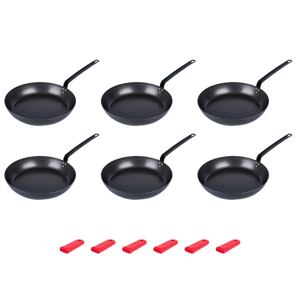 6 BLACK CARBON STEEL 14" PRE-SEASONED FRY PANS AND 6 SLEEVES