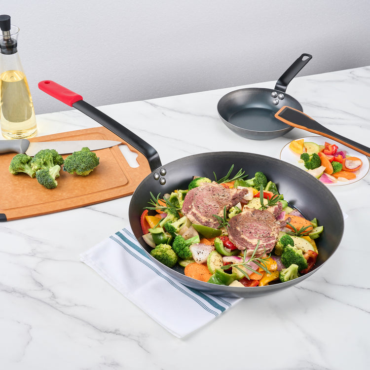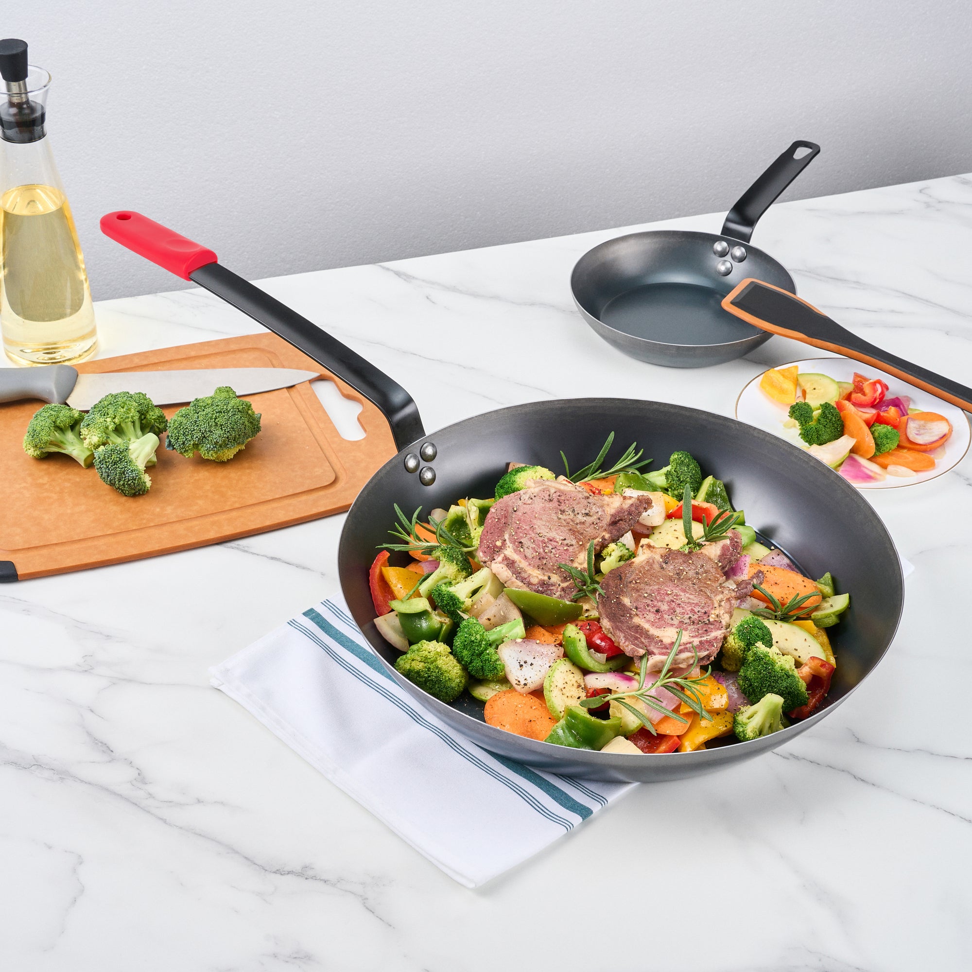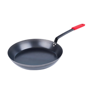 Cook pancakes with our Met Lux 6 Black Carbon Steel 16" Pre-Seasoned Fry Pans with 6 Red Silicone Pan Handle Sleeves. These fry pans are made from 1.5 mm thick carbon steel, offer exceptional heat distribution for even cooking and browning, ensuring consistent results every time. Lightweight yet durable, these carbon steel fry pans make maneuvering in the kitchen effortless, whether you're flipping pancakes or sautéing vegetables. Boasting non-coated surfaces, these frying pans provide superior performance and add a touch of elegance to your cookware collection. The triple-riveted handles of these cooking pans ensure secure connections, facilitating enhanced control in cooking. For added convenience, these skillet pans feature hanging holes, allowing for easy storage and quick access in busy kitchen environments. Designed for hand washing, these carbon steel skillets ensure optimal care and maintenance to extend their lifespans. Withstanding heat up to 450F, these removable handle sleeves keep your hands cool and secure, even during the busiest cooking times. The molded indentations on these pan handle sleeves provide secure grips, reducing the chances of slips and spills, which is crucial for maintaining kitchen safety. With removable designs, these silicone pan handle sleeves allow for easy cleaning and storage, fitting seamlessly into any kitchen routine. Including the handles, these 16-inch fry pans measure 28.54 inches in length by 15.75 inches in width by 5.79 inches in height. Each order includes 6 pans and 6 sleeves.